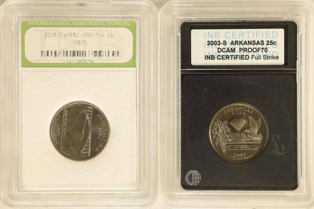 AND 2005-D WEST VIRGINIA MS70, THIS IS NOT FROM A REPUTABLE GRADING SERVICE, USE YOUR OWN JUDGEMENT, BIDALOT CANNOT GUARANTEE THE GRADES