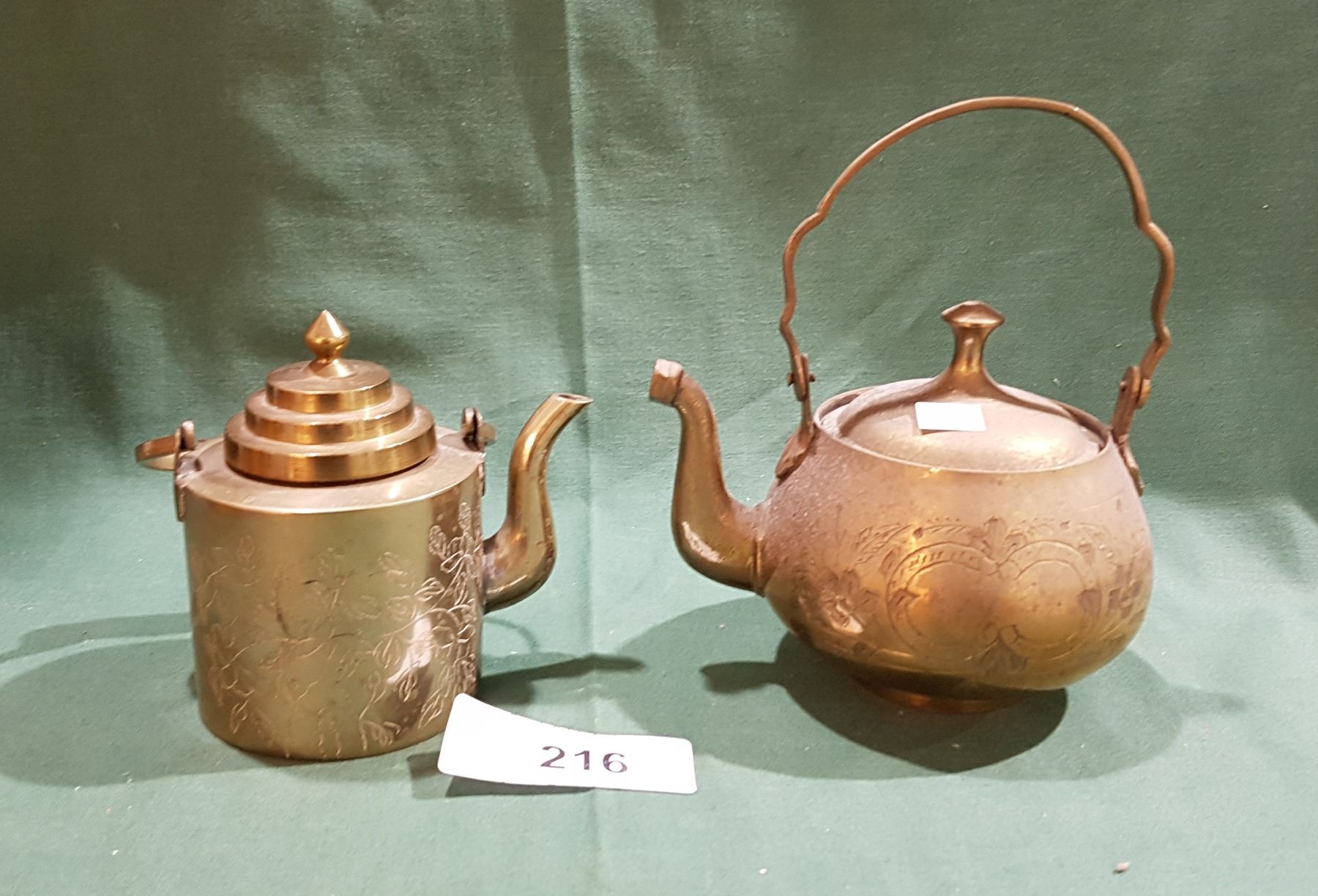 2 SMALL ASIAN MOTIF FLOWERED BRASS TEA POTS