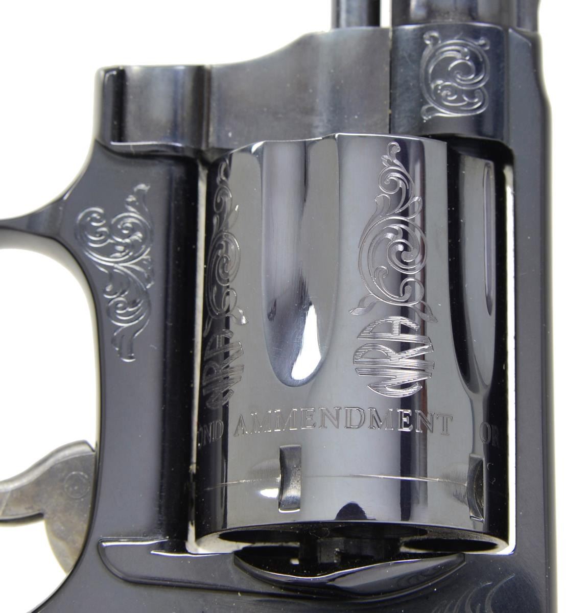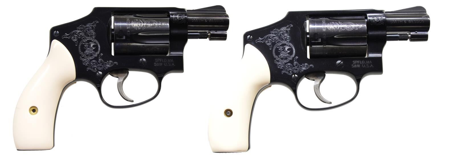 MODEL 442 WOMEN OF THE NRA DA REVOLVERS. ALL: cal. 38 S&W SPL. +P. This special Edition revolver dedicated to the Women of the NRA was issued during Sandra Froman's tenure as NRA president (2005-2007). Information cards w/ the guns picture Sandra Froman & quotes her views the guns as follow, "This model exemplifies the spirit & importance of our Second Amendment rights in a beautifully engraved piece that captures the essence of strong, powerful women who believe in their right to keep & bear arms." The first 130 of these 500 Special Edition guns had a spelling mistake on the cyl. The word "Amendment" was accidentally misspelled "AMMENDMENT". Only a portion of these had been sent to deals & distributors, S&W immediately asked for the guns to be returned, so cyls. could be replaced. To S&W's dismay, the distributor in possession of these 4 consecutive numbered guns declined to return them. It's believed that only a handful, other than these 4, are in circulation. Alloy J frame revolvers w/ concealed hammers. 1 7/8" Ribbed bbls. w/ serrated ramp front sights. Swing out fluted 5 shot cyls. Case colored triggers. Synthetic ivory rnd. butt grips. Ornamentation consists of scroll engraving on muzzle end of bbls., both sides of frame & cyl. between flutes w/ "NRA" markings. Left side of frame features the NRA seal. Inscription around the back of cyl. reads "ORIGINAL DEFENDER OF FREEDOM SECOND AMMENDMENT". UNATTACHED ACCESSORIES: both guns are housed in original blue molded S&W boxes w/ matching S# labels. Boxes contain instruction manuals, S&W club, laser engraving, NRA pamphlets & Sandra Froman cards along w/ trigger locks & fired cases. Also included are glass fronted wooden display cases w/ blue velour interiors having NRA seal on lids. CONDITION: both guns appear near new & unfired showing a slight drag line on the cyls. 1) S# NRA0210. (19-339/DS). 2) S# NRA0211. (19-340/DS). ALL MODERN. $4,000-6,000.