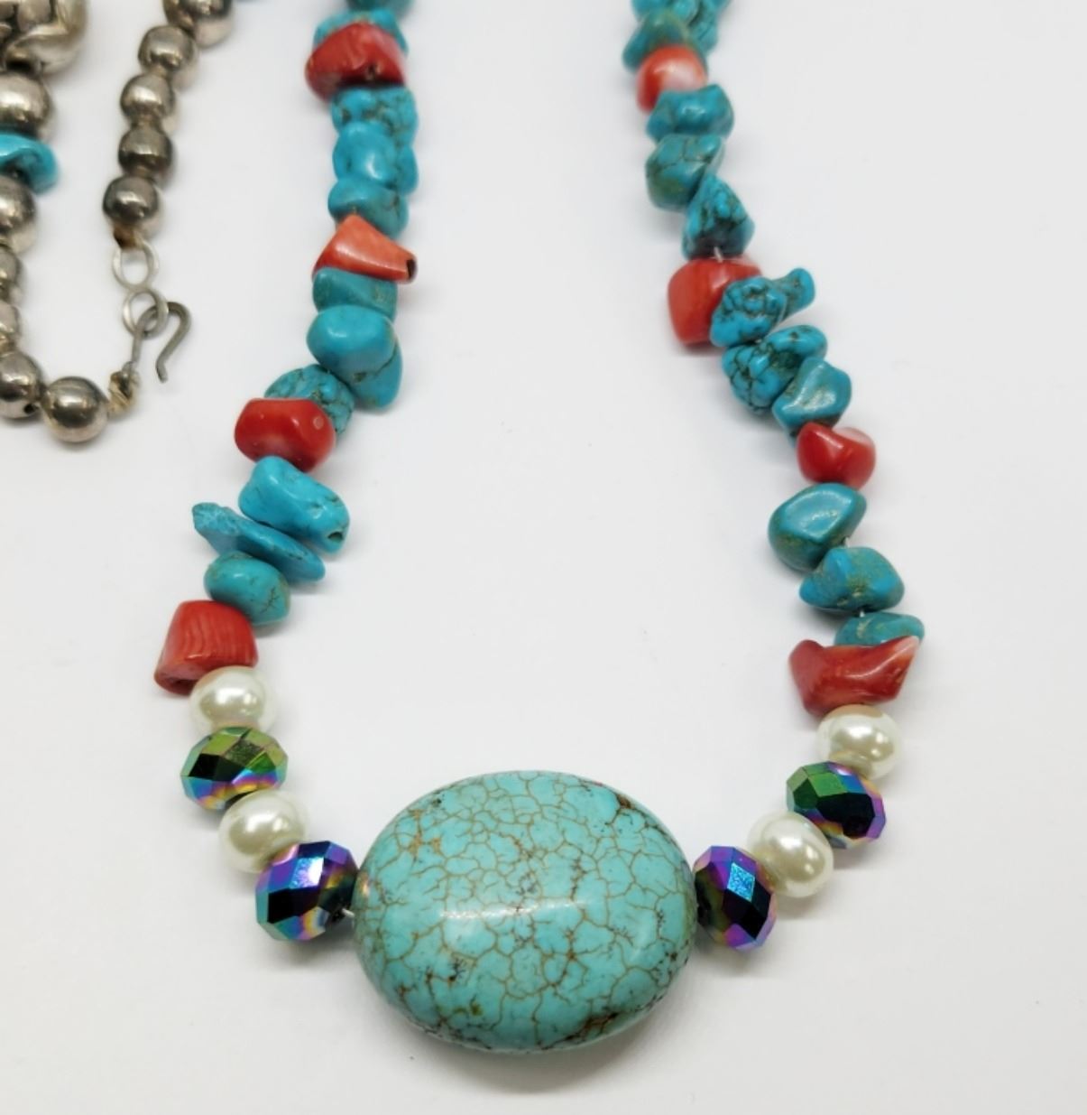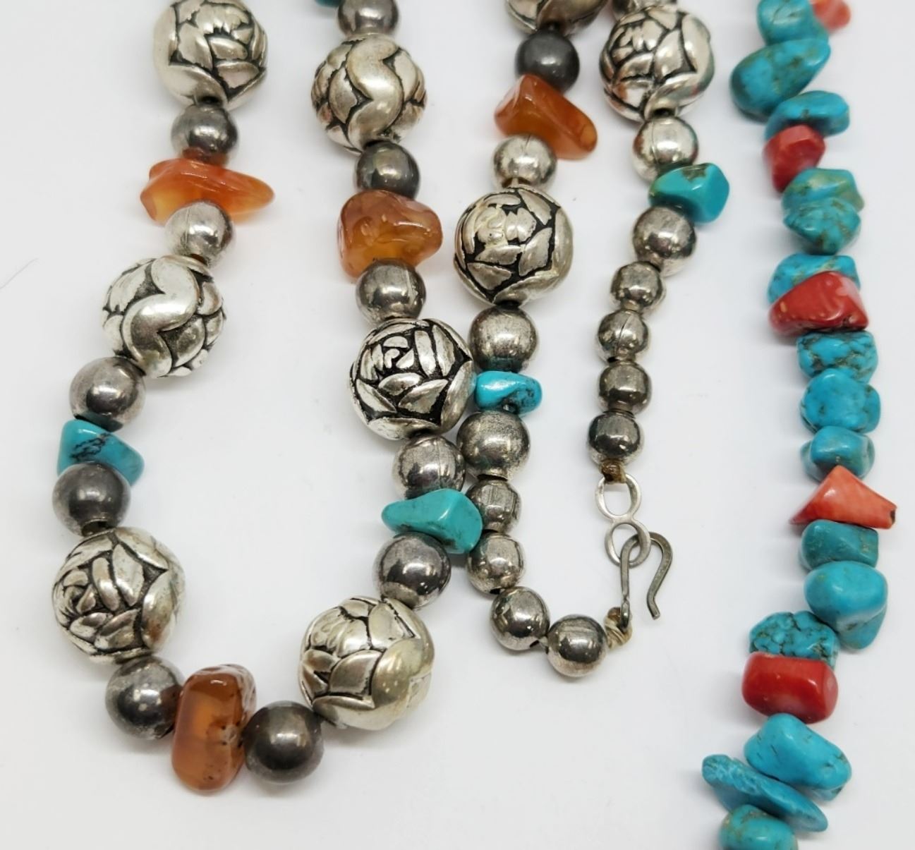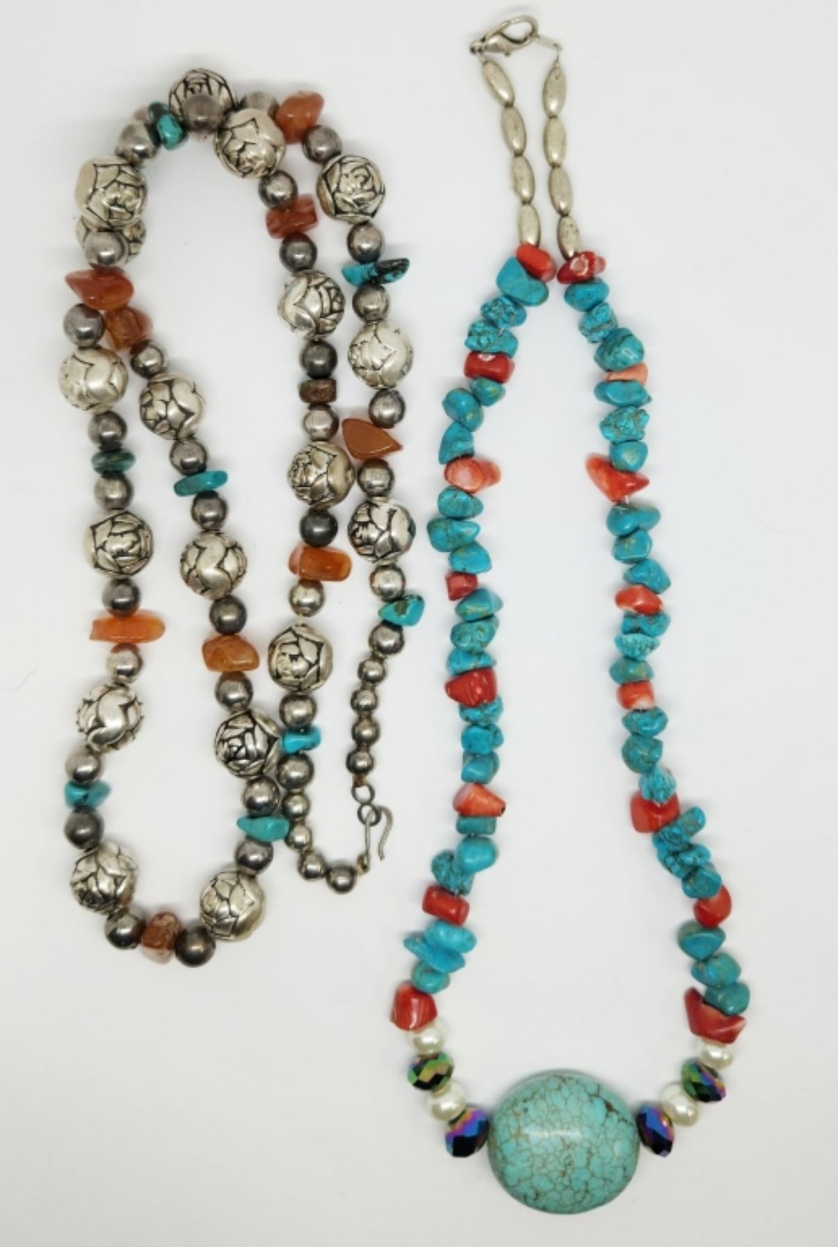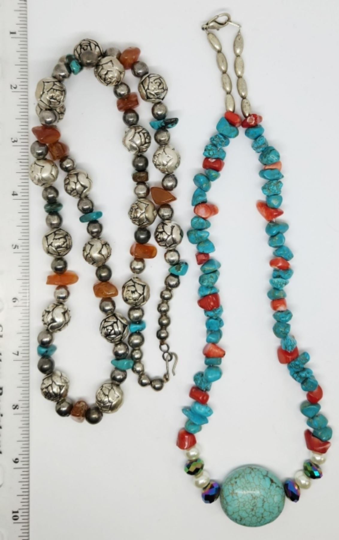WITH TURQUOISE-CORAL & AMBER STONES (1)MEASURES 20 INCHES & (1)MEASURES 28 INCHES