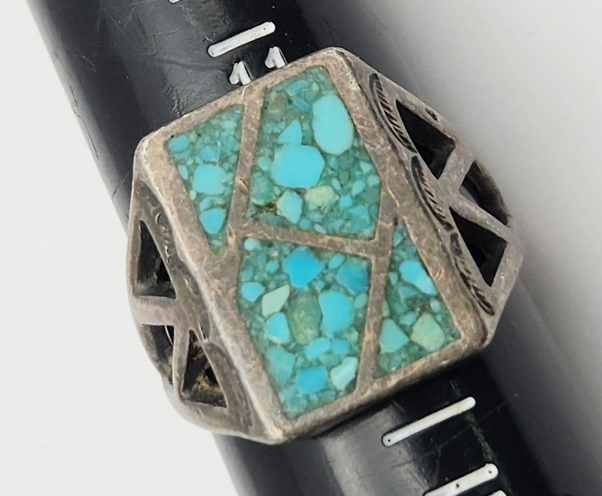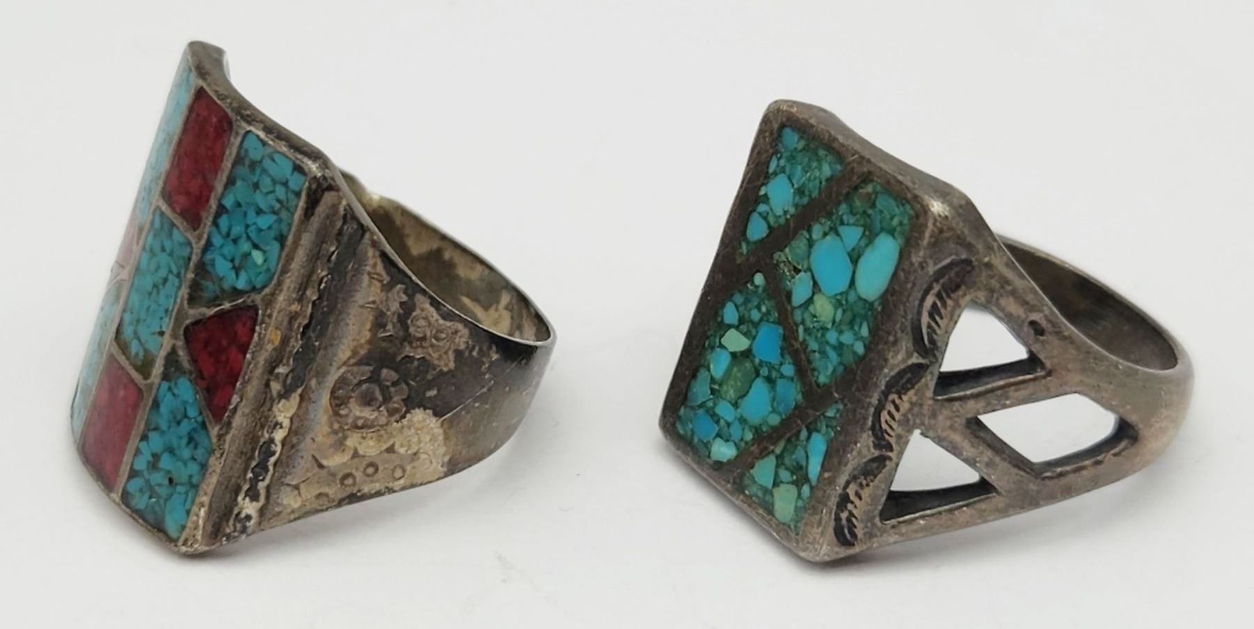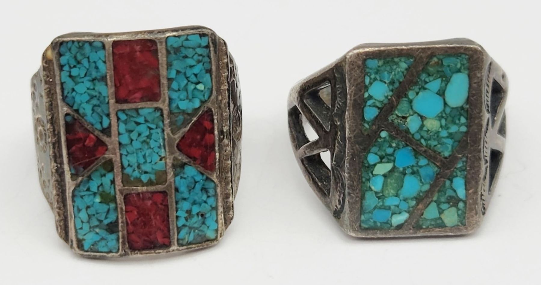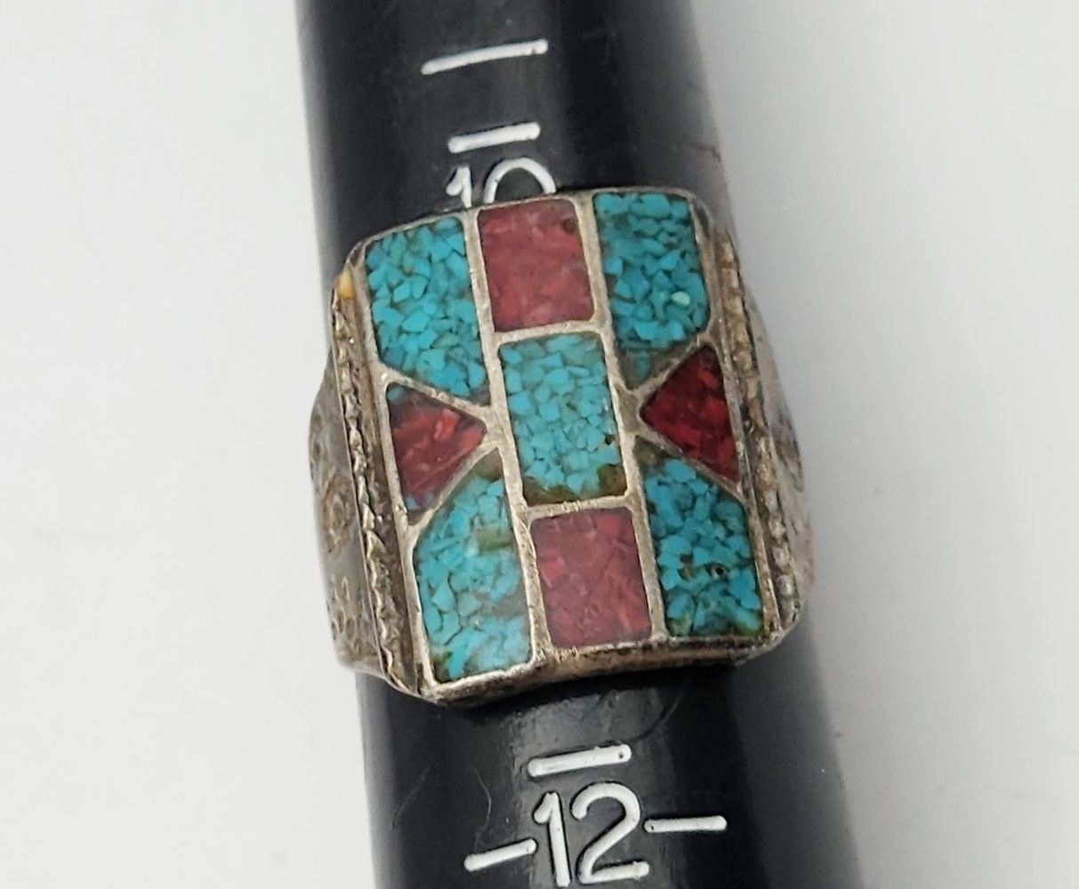 CHIPED RED CORAL AND TURQUOISE INLAY DESIGN-RING SIZES 11 & 12-TOTAL 14 DWT