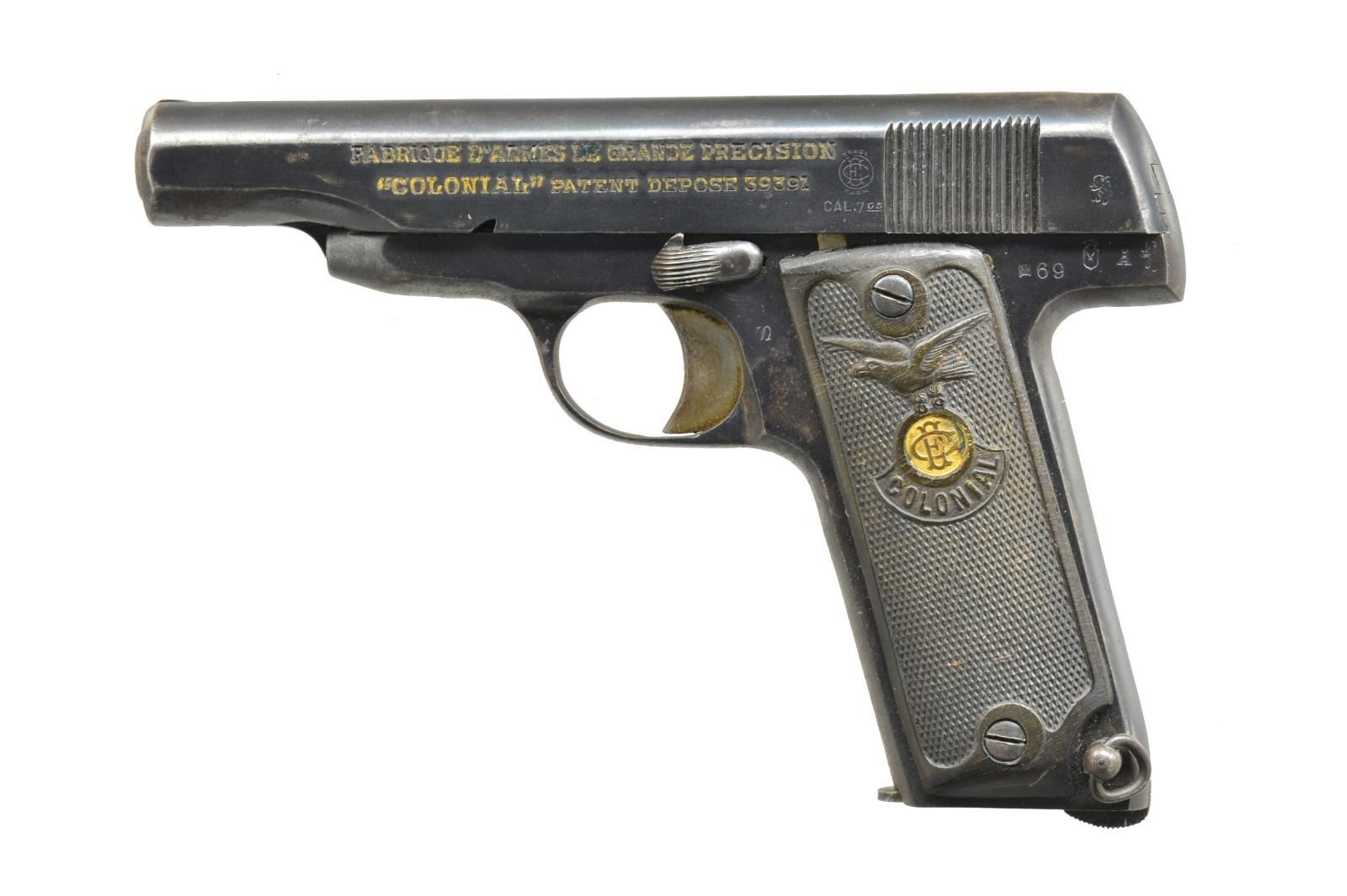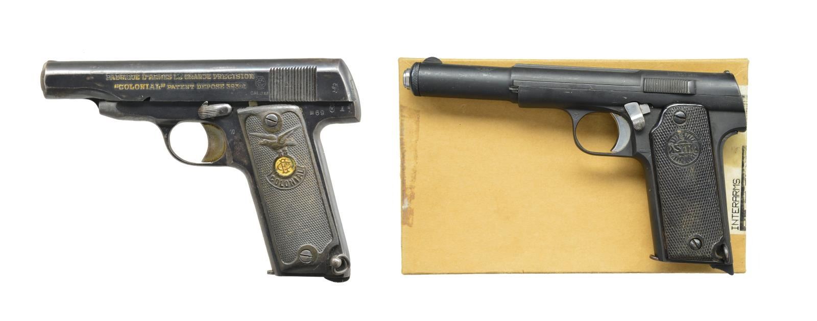 1) FABRIQUE D'ARMES DE GRANDE PRECISION "COLONIAL". Cal. 7.65mm. S# 2209. Bbl. 4". Blued finish. Fixed sights. Original grips. Bottom release mag. Frame safety. MAGS: 1-8 rd. CONDITION: overall fair w/ wear & scattered freckled oxidation. Grips show wear. Slightly frosted bore w/ good rifling. (20-3658/ZAL). MODERN. 2) ASTRA M1921. Cal. 9mm Largo. S# 30198. Bbl. 6". Dull blue metal finish. Astra checkered grips. Lanyard ring. Bottom mag release. MAGS: 1 - 8 rd. UNATTACHED ACCESSORIES: Interarms box for Astra 400 Mod 1921 w/ non matching number. Box includes accessories. CONDITION: very good restored metal finish w/ strong markings. Grips show wear w/ a cracked right panel. Lightly frosted bore w/ good rifling. (20-3691/ZAL). CURIO. $400-600.