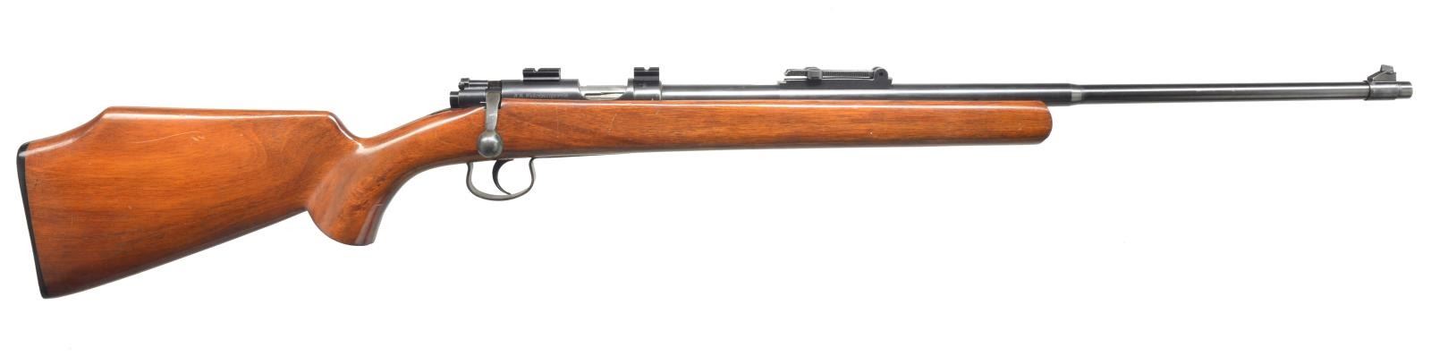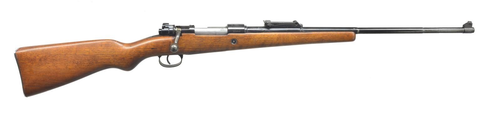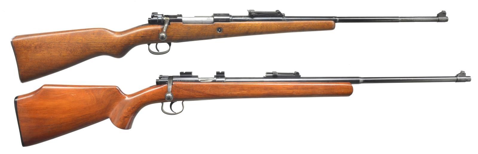 1) MODEL 1924 SERBIAN MAUSER. Cal. 8mm Mauser. S# 212548. 24" Step bbl. retains military sights. Model 98 lg. ring action w/ Serbian crest on receiver ring & other information on side wall. Bolt w/ matching number has bent back handle. Bottom metal also matches. Military stock is cut down to sporter length & retains steel buttplate. CONDITION: good as refinished. Metal parts retaining most of a shiny reblue. Sharp edges & lettering washed. Stock retains most of an oil finish. Good bore w/ sharp rifling; frosted throughout. Mechanically good. (20-3610/MGM). 2) GUSTLOFF WERKE SINGLE SHOT 22. Cal. 22 LR. S# 247979. 26" Military style stepped bbl. is fitted w/ military style sights. Later style single shot action is drilled & tapped for scope mounts & has had bolt handle ground to clear scope. Replacement stock of American walnut w/ Herters buttplate has high Monte Carlo comb. CONDITION: metal parts retain over 90% original blue. Stock has nearly all its custom finish. Bore is very fine. (20-3632/MGM). BOTH MODERN. $250-400.