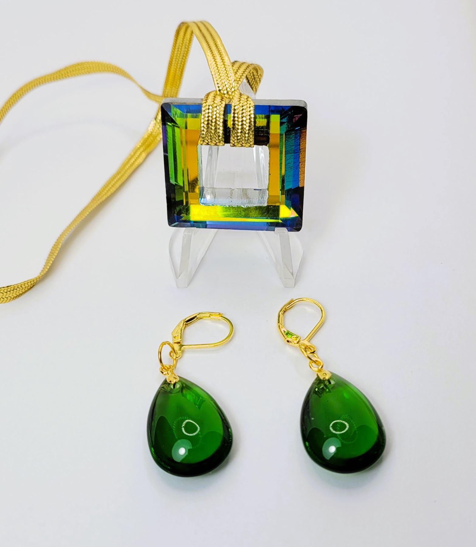 ON GOLD TONE CORD AND COORDINATING GREEN TITANIUM CRYSTAL TEARDROP EARRINGS ON LEVERBACK WIRES. JEWELLERY
