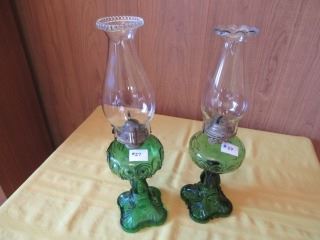 2 SQUARE GREEN SWIRL LAMPS WITH CHIMNEYS