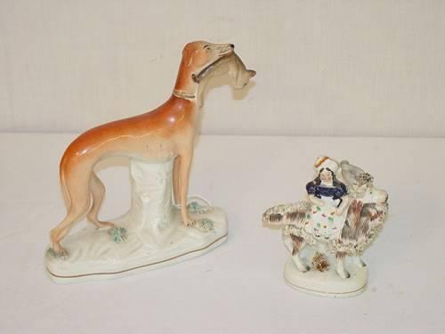 (2) STAFFORDSHIRE ANIMALS: 7 1/2" WHIPPET W/ DEAD GAME IN MOUTH & 5" GIRL ON GOAT - BOTH W/ SMALL CHIPS;