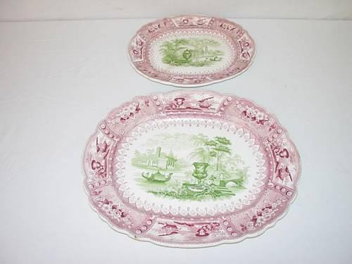 (2) STAFFORDSHIRE BI-COLOR TRANSFER PLATTERS-BOTH RED & GREEN CANOVA PATTERN BY T. MAYER - SMALLER IS 13" W/ LARGE CRACK & LARGER IS 17" W/ MINOR WEAR;