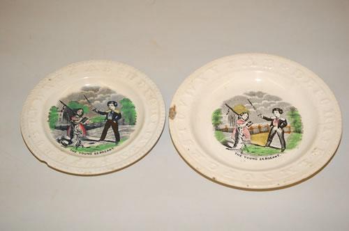 (2) STAFFORDSHIRE TRANSFER CHILDS ABC PLATES W/ POLYCHROME DECORATION - (1) 6" "THE YOUNG SERGEANT" & (1) 7 1/4" "THE YOUNG SERGEANT"-BOTH W/ ALPHABET & ROPE BORDERS, 6" PLATE MARKED ELSMORE & FOSTER-CHIPS, HAIRLINES, CRAZING, STAIN, IMPERFECTIONS