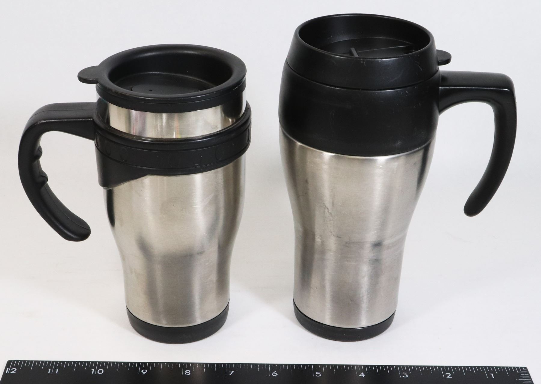 2 STAINLESS STEEL TRAVEL MUGS WITH HANDLES