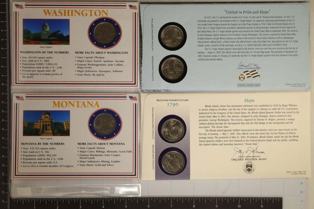 FDC'S: 2007-P MONTANA, 2007-P WASHINGTON (BOTH WITH UNCANCELLED STAMPS ON CARDBOARD INFO CARD), 2009-P & D US VIRGIN ISLANDS FDC AND 2001-P & D RHODE ISLAND FDC