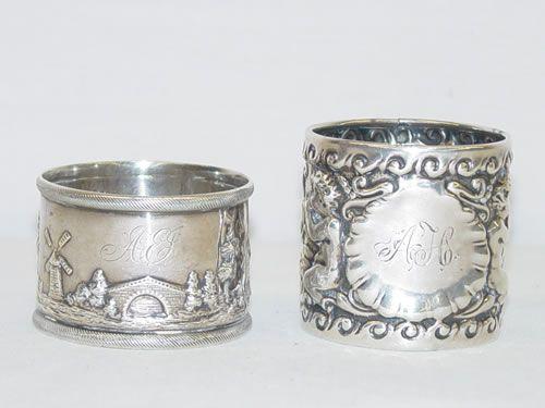 (2) STERLING NAPKIN RINGS: (1) W/ CHERUBS & DRAGONS (SLIGHTLY OUT OF ROUND) & (1) W/ EUROPEAN LANDSCAPE W/ WINDMILLS, BRIDGES, ETC. - BOTH W/ MONOGRAMS