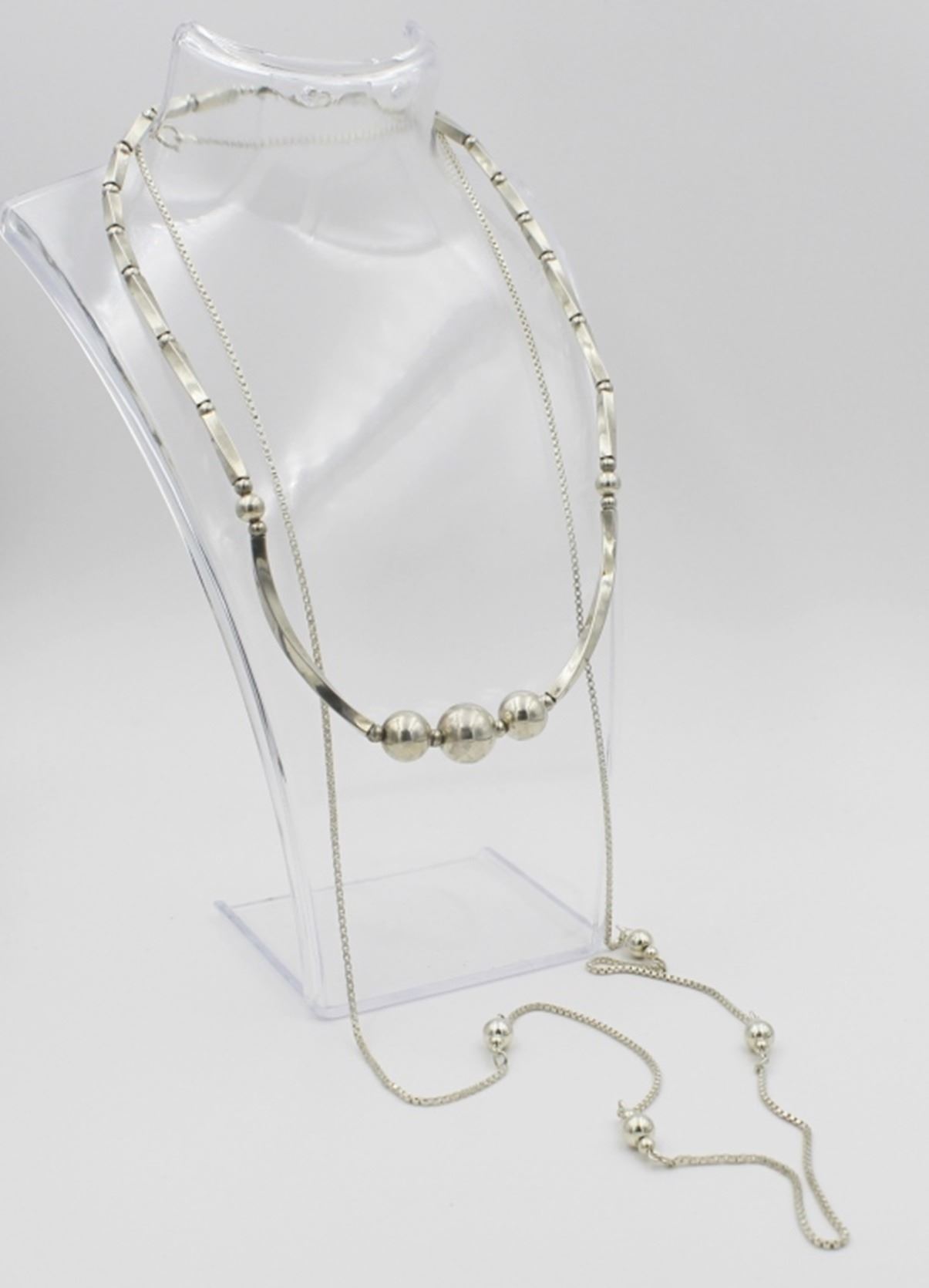 2 - STERLING SILVER NECKLACES WITH BALL BEADS. ONE HAS THICKER BEADS AND IS 17" LONG. AND ONE IS THINNER AND 36" LONG. PRE-OWNED. 29.8 GRAMS TOTAL. ESTIMATE: $75-$100