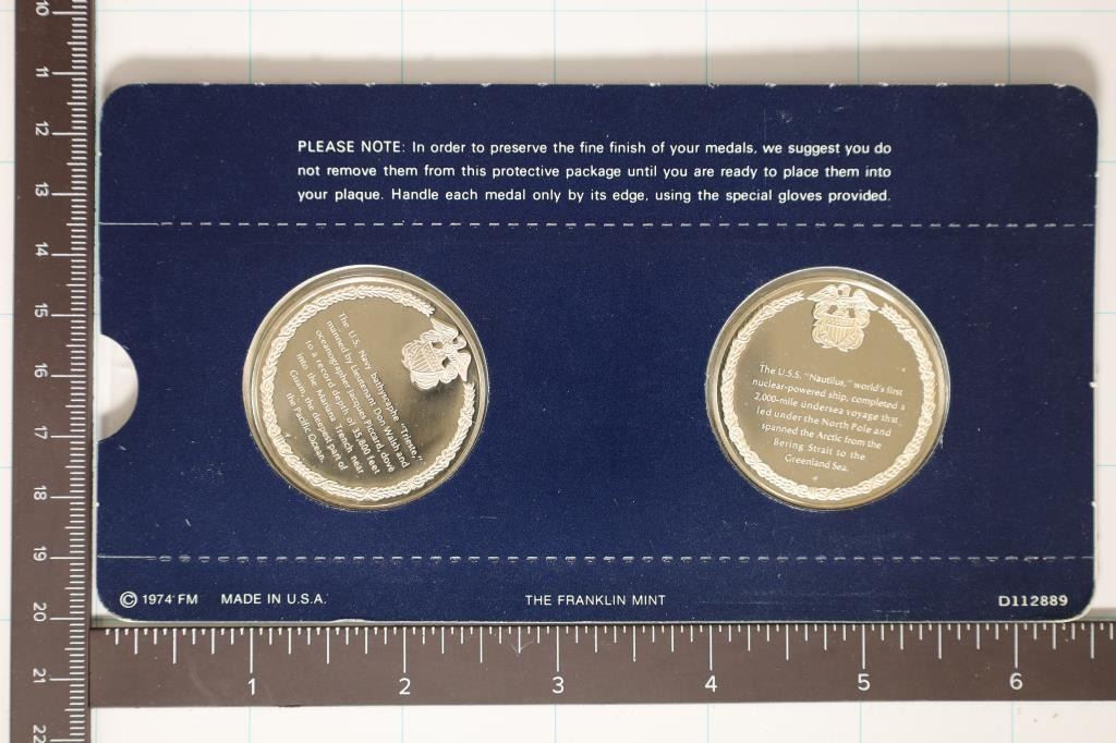 OF THE US NAVY, EACH IS APPROX. .7 OZ OF SILVER. 1ST EDITION WITH INFO CARD. TRIESTE SETS DIVING RECORD AND NAUTILUS CROSSES BENEATH THE NORTH POLE. IN ORIGINAL MINT PACKAGING BY THE FRANKLIN MINT
