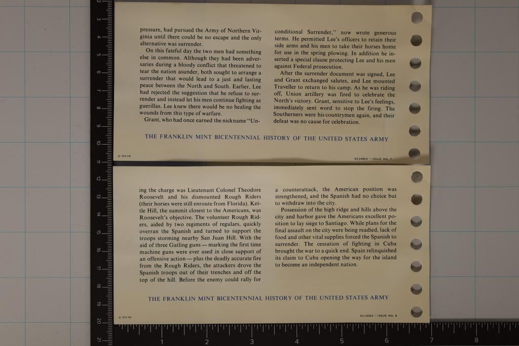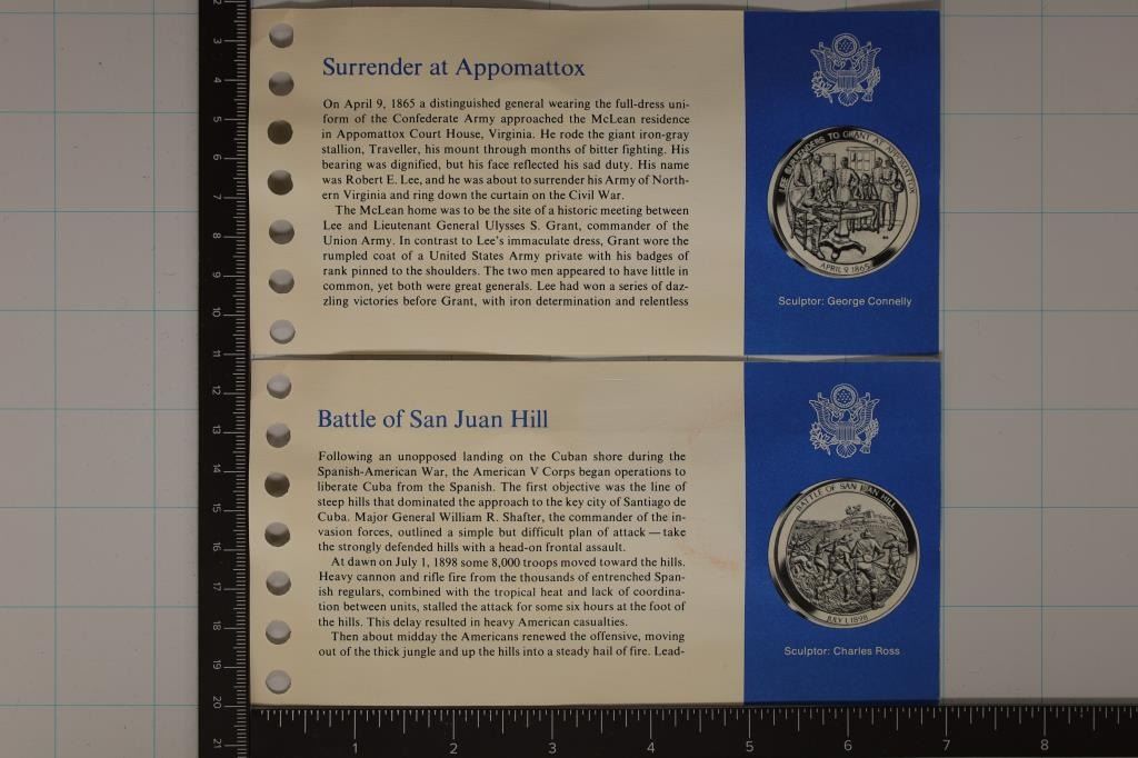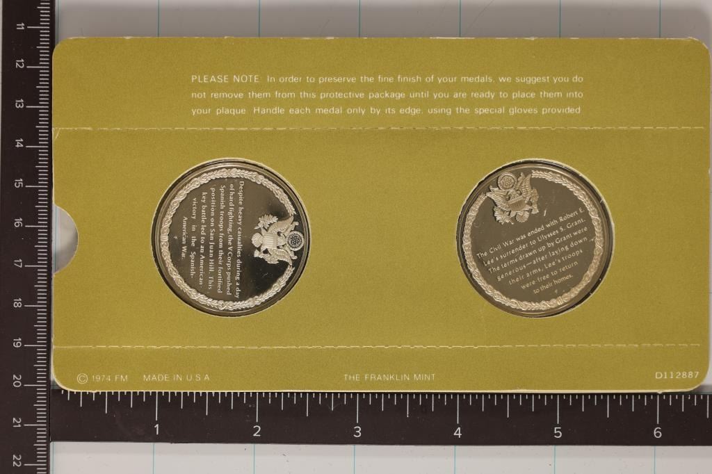 HISTORY OF THE UNITED STATES ARMY "BATTLE OF SAN JUAN HILL" AND "SURRENDER APPOMATTOX" IN FRANKLIN MINT PACKAGING WITH INFO CARDS, EACH IS APPROX. . 7 OZ. OF SILVER (1.4 OZ. ASW APPROX TOTAL)