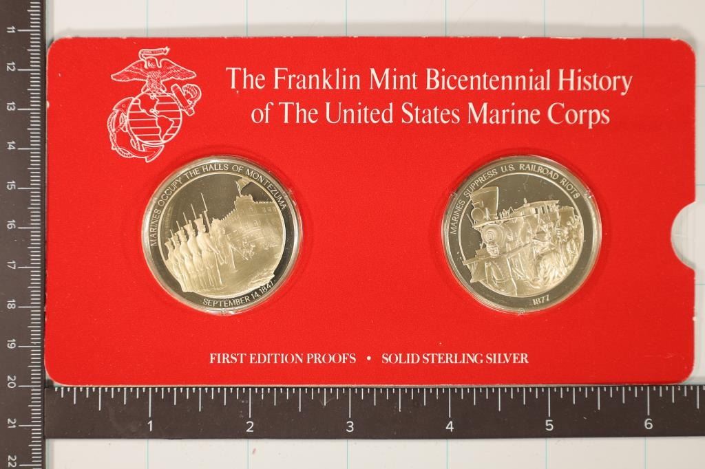 HISTORY OF THE UNITED STATES MARINE CORPS "HALLS OF MONTEZUMA" AND "SUPPRESSION OF 1877 RAILROAD RIOTS" IN FRANKLIN MINT PACKAGING WITH INFO CARDS, EACH IS APPROX. . 7 OZ. OF SILVER (1.4 OZ. ASW APPROX TOTAL)