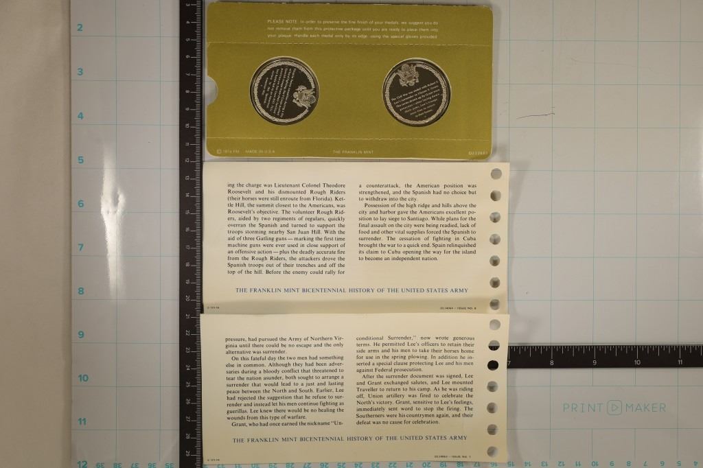 HISTORY OF THE UNITED STATES ARMY "BATTLE OF SAN JUAN HILL" AND "SURRENDER APPOMATTOX" IN FRANKLIN MINT PACKAGING WITH INFO CARDS, EACH IS APPROX. . 7 OZ. OF SILVER (1.4 OZ. ASW APPROX TOTAL)