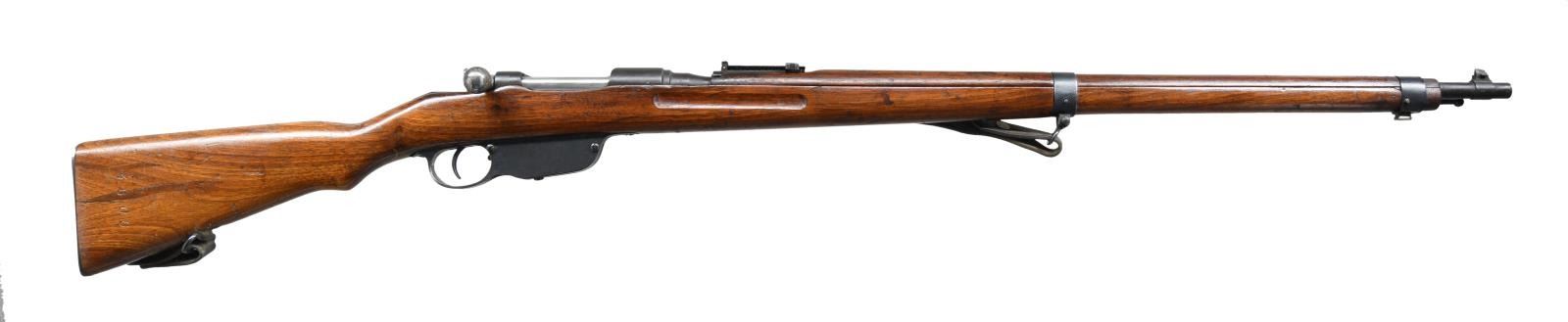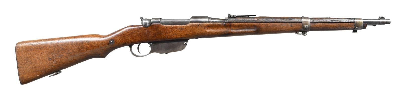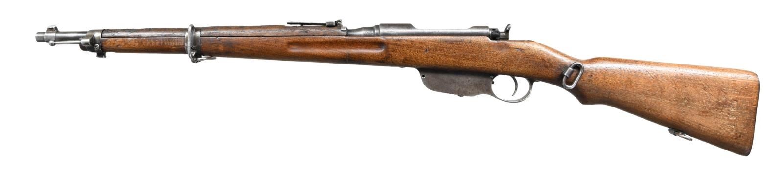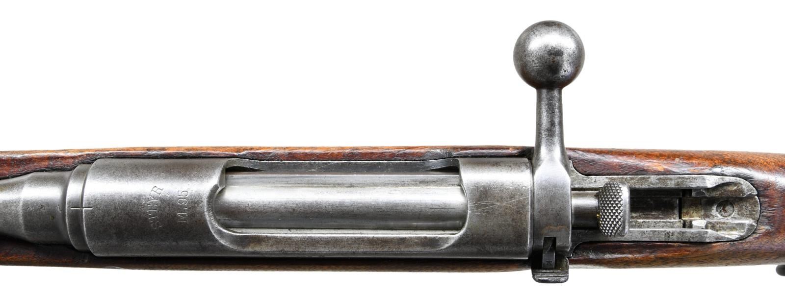 1) Cal. 8x50. S# 9976J. Bbl. 19". Matching numbers on bbl. Mismatched stock. Top of bbl. has faint Austrian acceptance that appears to be 1916. Top of receiver is marked "STEYR/M.95". Odd long rear sight graduated to 2000m. Rear sight is missing a screw. Blade front sight. Hardwood stock set w/ left side sling swivels. Rear sling mount is missing forward screw. Buttplate has unit marking that reads "JR13/80". CONDITION: handguard has a missing 2 1/2" section at front & a few cracks along its length. Arsenal reworked stock otherwise shows some scarring from improper band removal, scattered dings & handling marks. Metal is mostly a silvery gray patina w/ some scattered light pitting & oxidation staining. Worn bore w/ scattered frosting & oxidation. (23-1949/MJC). 2) AUSTRIAN. Cal. 8x56mmR. S# 4606J. Bbl 30-1/2". Austrian M95 manufactured by Steyr. Blued finish with solid wood buttstock and handguard. Chamber is stamped "STEYR/ M.95", with an "S" (Spitzer conversion) stamp over the breech above an indiscernible Austrian military acceptance proof. Receiver and barrel are matching, with the front barrel band, bolt assembly, and buttstock being force matched, likely at the arsenal. Rifle is mounted with a period brown leather sling. CONDITION: Very good as refurbished, with metal components retaining the majority of their likely arsenal reapplied blue finish, exhibiting some minor wear and some areas of pitting beneath the bluing. Bright bore, exhibiting some mild pitting and strong rifling throughout. Stock exhibits scattered marks and minor impressions from storage and handling, but is otherwise sturdy and serviceable. Leather sling is very good. (23-2034/MLW). ALL CURIO. $300-600.