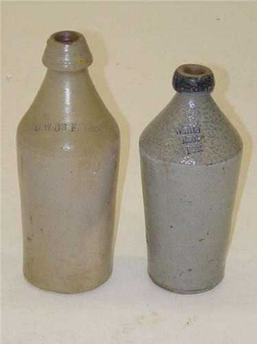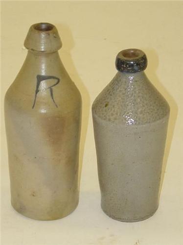 (2) STONEWARE BOTTLES: (1) 9 1/2" WHITE ROOTBEER W/ COBALT RING TOP (GOOD CONDITION) & (1) D.W. DEFREEST W/ COBALT SCRIPT "R" (GOOD CONDITION)