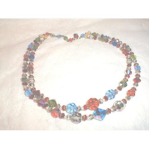 FOR SALE IS A BEAUTIFUL 2 STRAND CRYSTAL BEADED NECKLACE THAT IS IN VERY GOOD CONDITION. THE COLOR OF THE BEADS ARE BLUE, RED, AMBER, GREEN AND CRYSTAL AND ALL ARE IRIDESCENT. EACH BEAD HAS A SMALL SEA PEARL TO SEPARATE. THIS NECKLACE MEASURES 16 1/2 IN. IN LENGTH.