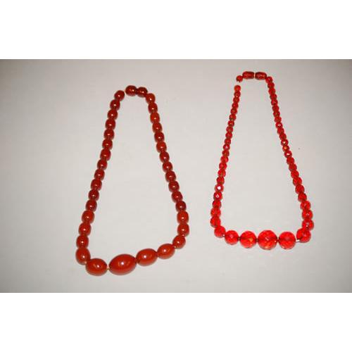 (2) STRANDS CHERRY AMBER TYPE GRADUATED BEADS -<BR>(1) 17" STRAND OF OVAL NON-FACETED BEADS W/ THREADED<BR>AMBER CLASP & (1) 16 1/2" STRAND ROUND FACETED BEADS<BR>W/ THREADED CLASP