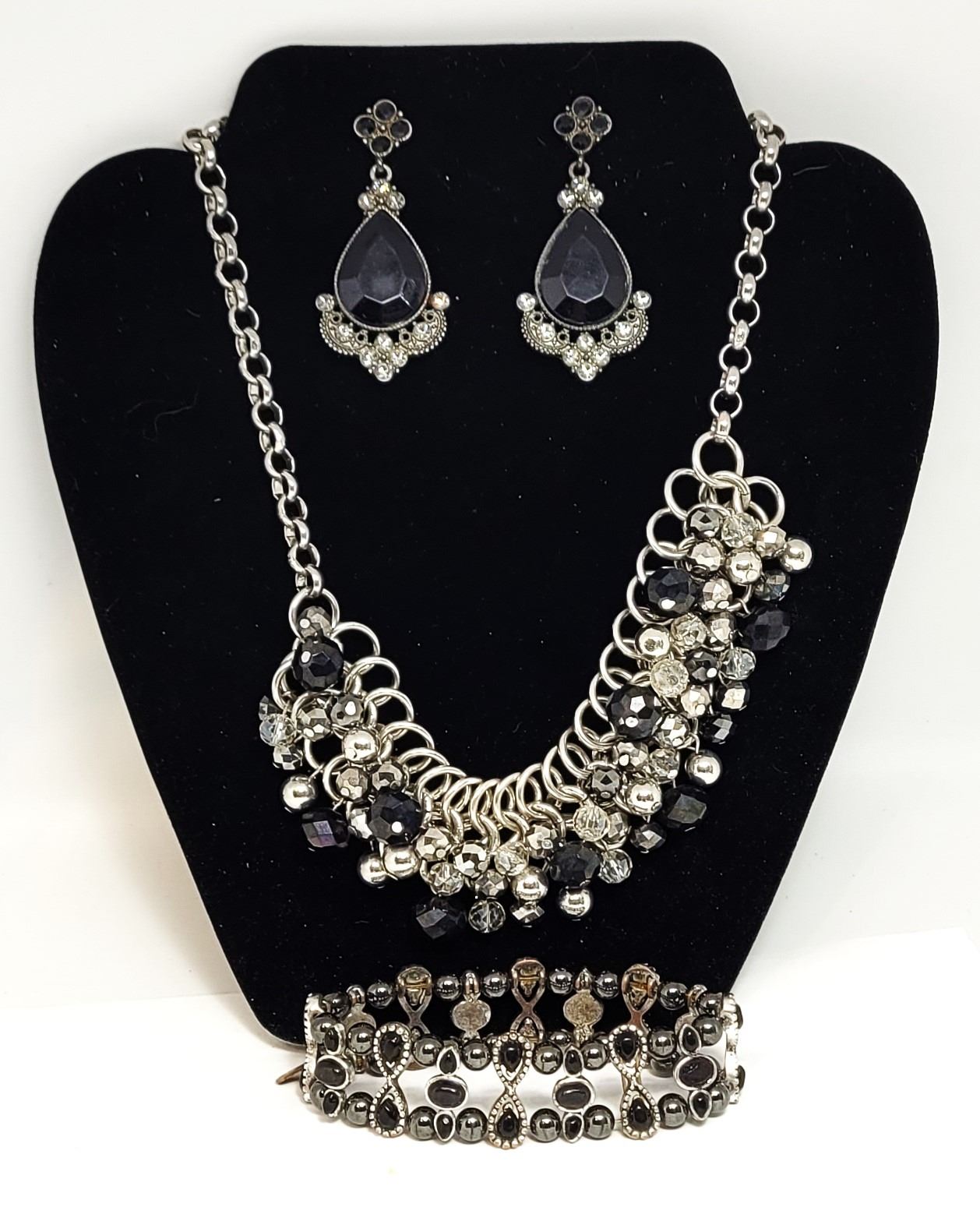 NECKLACE, DROP EARRINGS AND BRACELET, NECKLACE IS 17" WITH A 3" EXTENDER. JEWELLERY