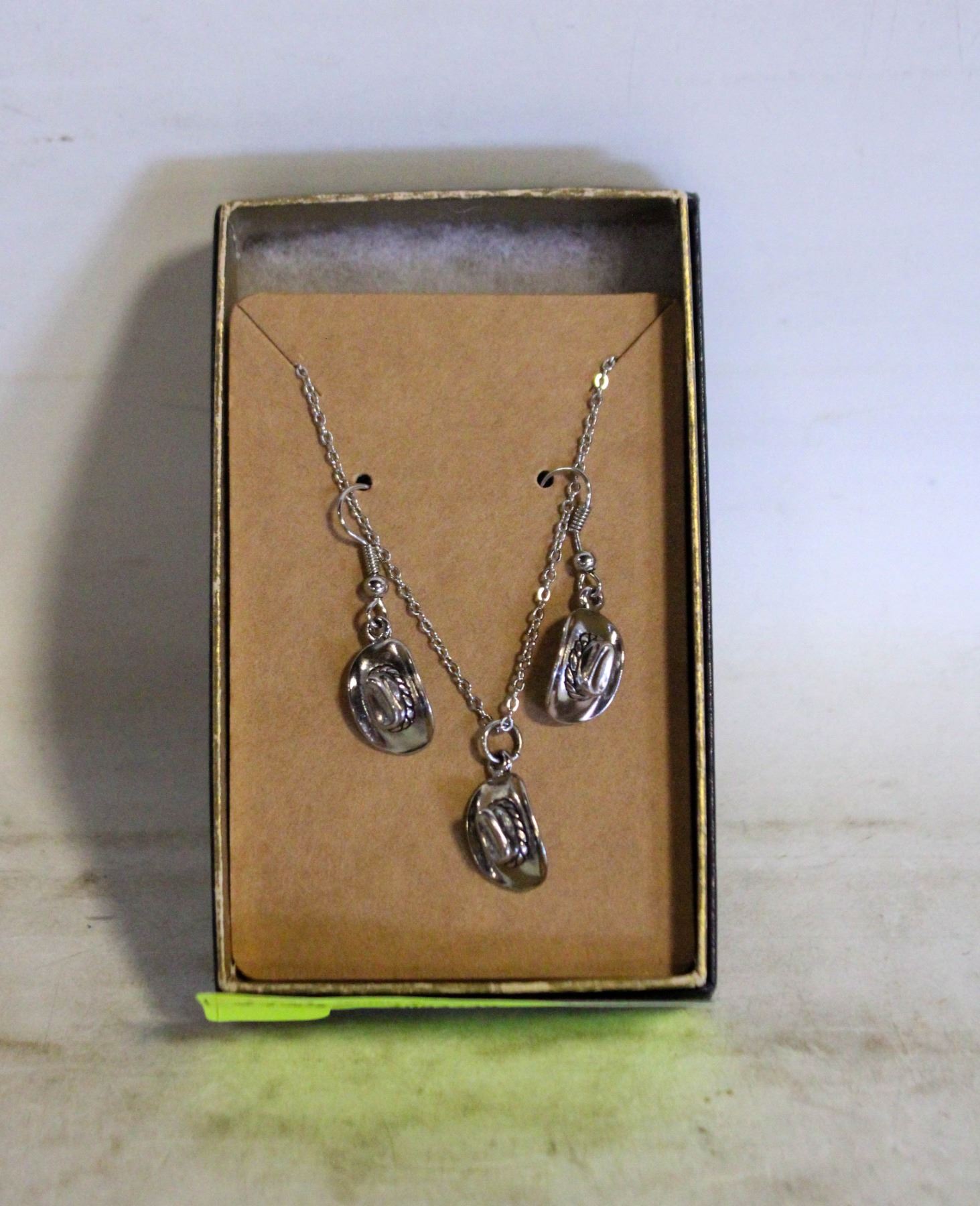 1) NEW SILVER TONE WAGON NECKLACE AND EARRINGS SET – 46 CM CHAIN WITH SPRING RING CLASP. 2) NEW SILVER TONED COWBOY HAT SET, 44 CM CHAIN. COMES WITH BOX.