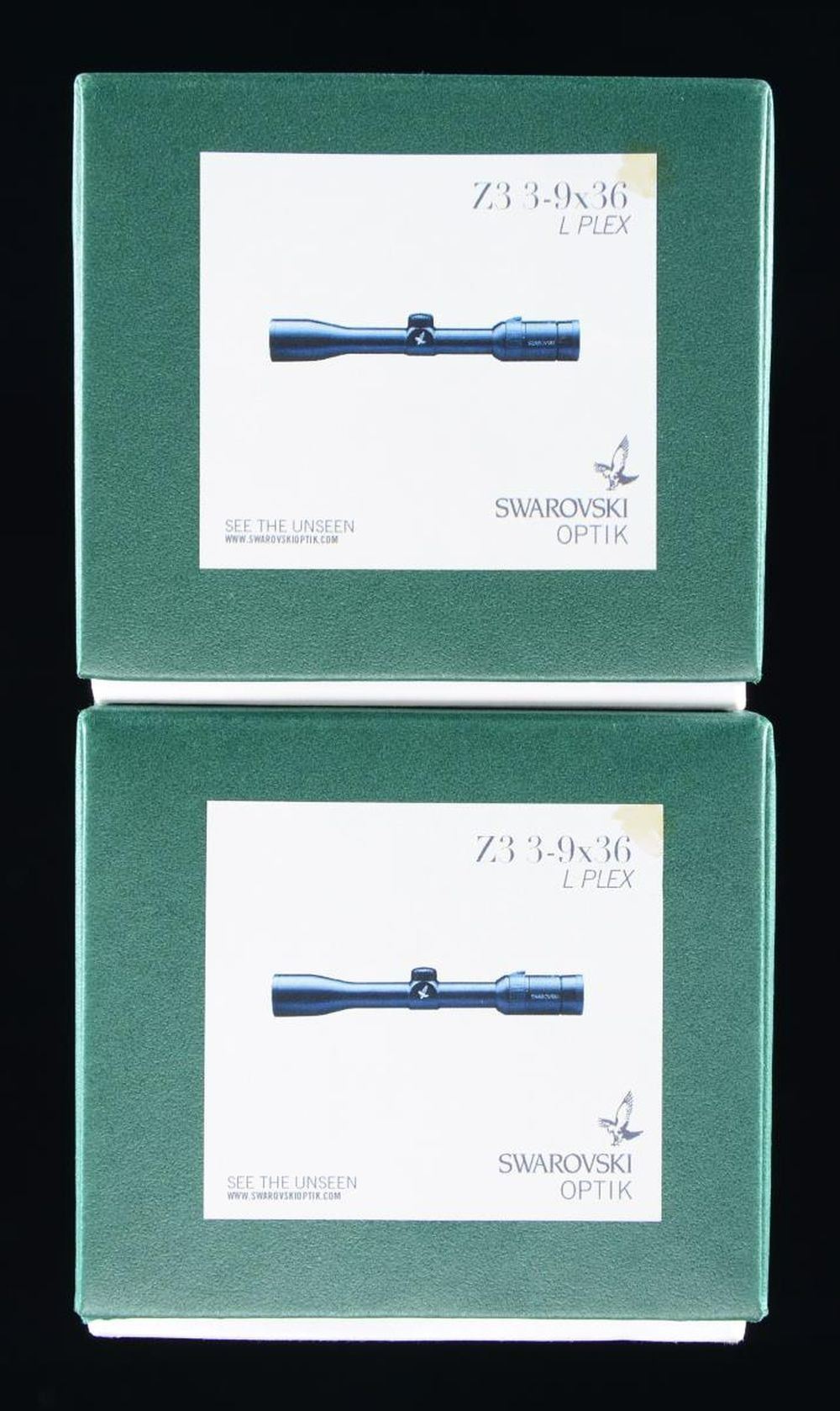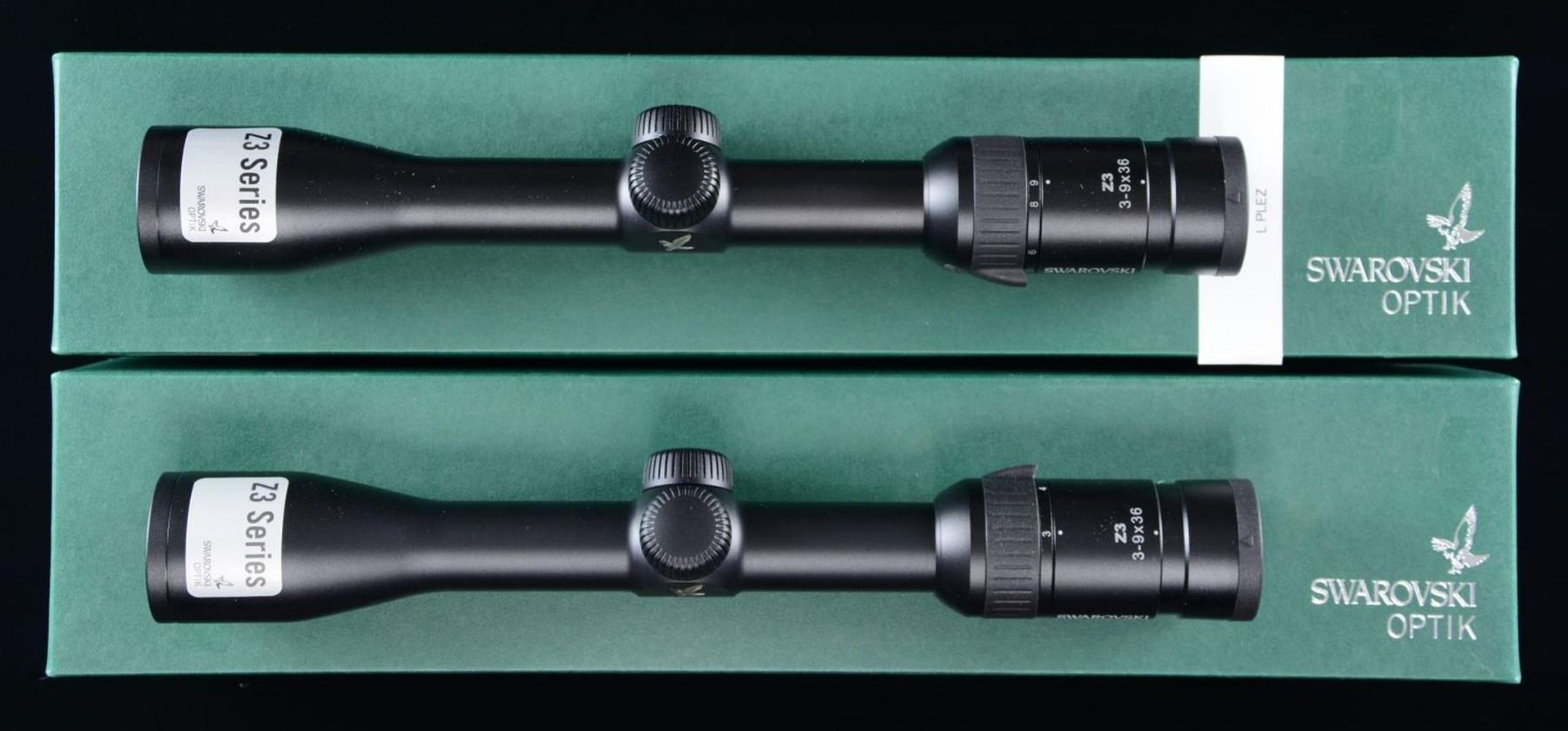 UPC: 708026590313. Each comes with matching numbered box & packaging. 1) S# MA8650243 2) S# MA8550942. CONDITION: scopes are near excellent w/ clear optics. Boxes look very good to near excellent, w/ previous retailer stickers. PROVENANCE: the Collection of Gun Sport Ltd owned by Jon R. Thomas. (02-20718/MD). $800-1,100.