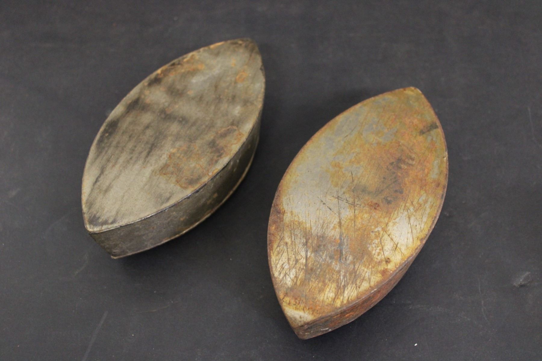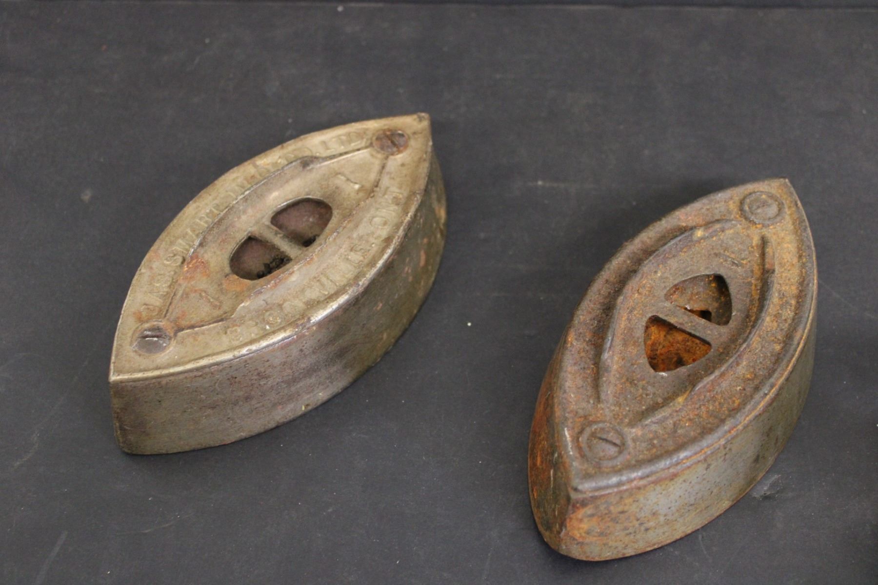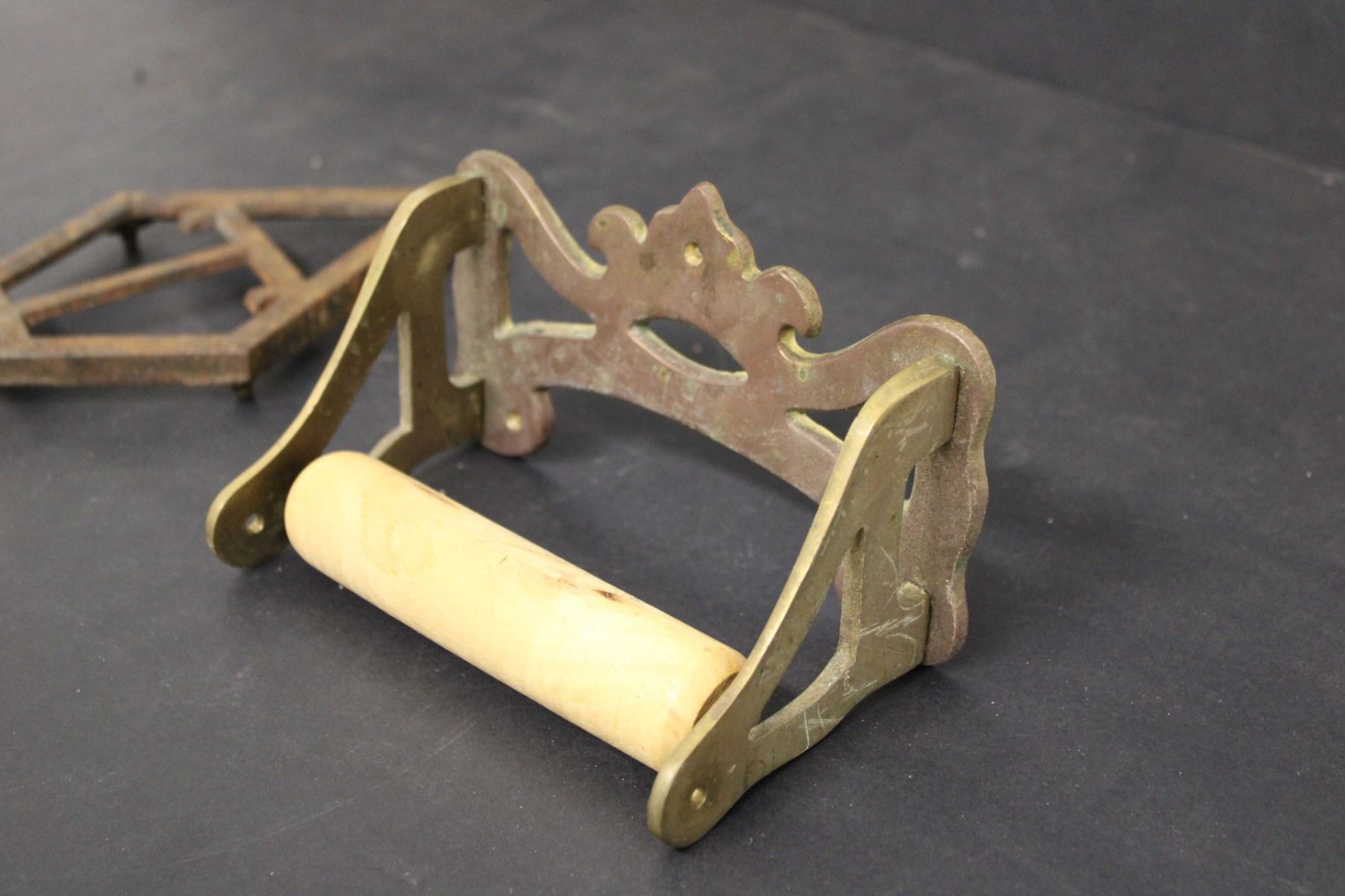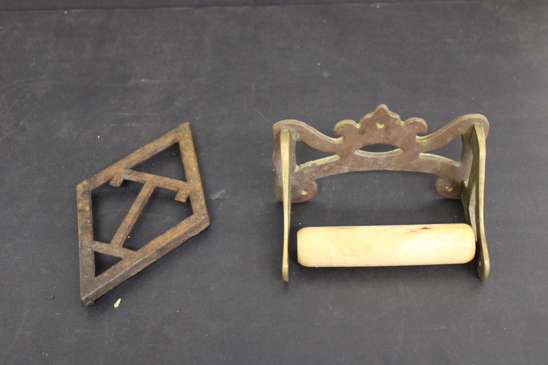 (2) Sad Irons (No Handles), Vintage Toilet Paper Roller, Trivet