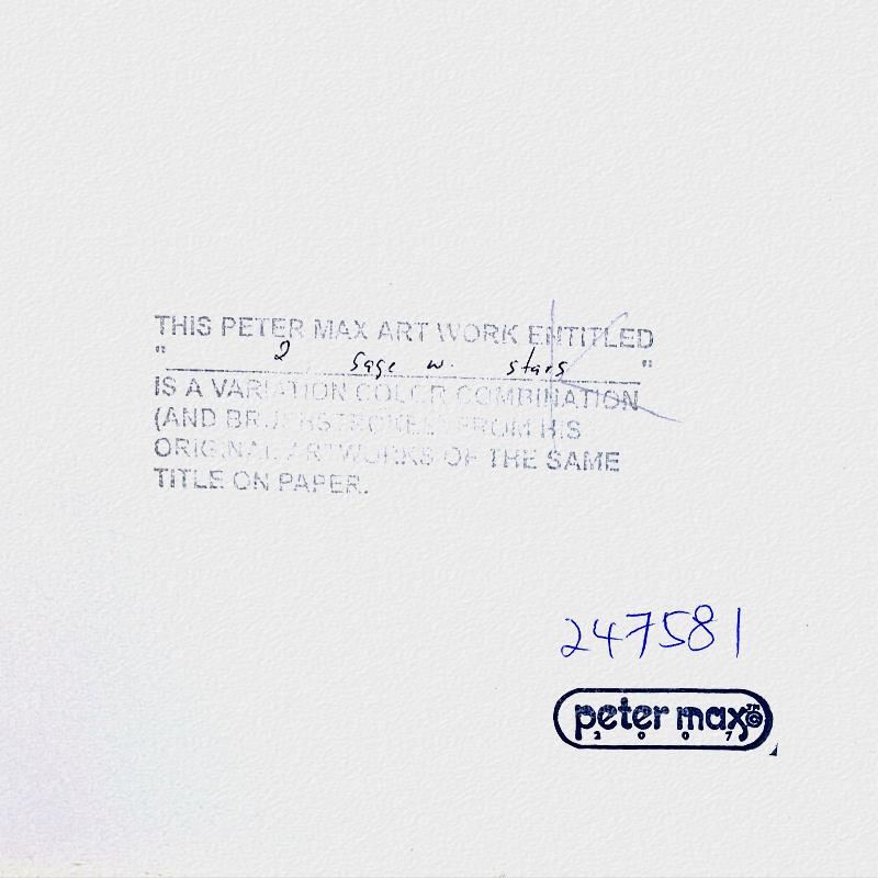 "2 Sages with Stars" is a one-of-a-kind mixed media on paper, hand signed by Peter Max. The piece comes custom framed with a backside cutout to display Peter Max Studio registration number 247581 certifying authenticity. Measures approximately 28" x 24" (frame), 19" x 15" (image). This item requires special handling and may have a longer than usual turnaround.