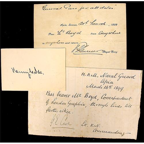 <Our item number 140104><B>Two Samoan Press Passes During The 1899 Civil War Plus An Autograph.</B> Two 1899 manuscript press passes for Mr. Boyd, correspondent of the London Graphic, permitting him through the lines during the British intervention in the Samoan Civil War. Both from Apia (Samoa); one dated 2 March and headed "General Pass for all dates" and signed by Lt. Gurner, Royal Navy; the other is headed "H.B.M. Naval Guard," dated 16 March, and signed by G.E. Cave, Lt. R.N. Commanding. Rare souvenirs of the crucial British and American operations in Samoa in 1899. Both age toned.<BR><BR>With the signature of Henry C. Ide on a 2½ x 3½ in., c.1900. Ide (1844-1921) was the US commisioner chief justice of Samoa, member of the Philippine Commission, 1900-06, in charge of finance and justice, governor-general of the Philippines, 1906, and US minister 1909-13. <BR>Estimated Value $500 - 600. <BR><BR>Our item number 140104<BR><IMAGES><P ALIGN="CENTER"><IMG SRC= "http://www.goldbergcoins.net/liveauction/49jpegs/140104.jpg"> </P></IMAGES>