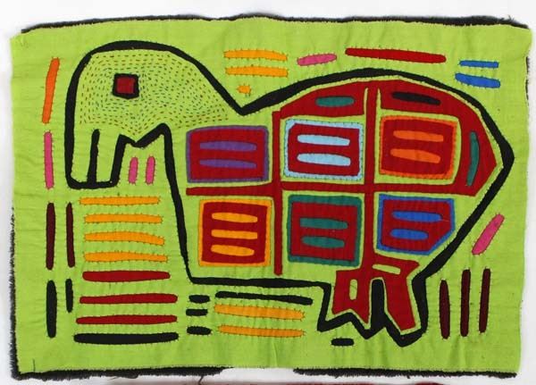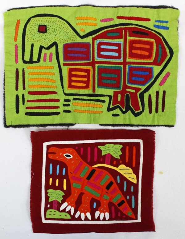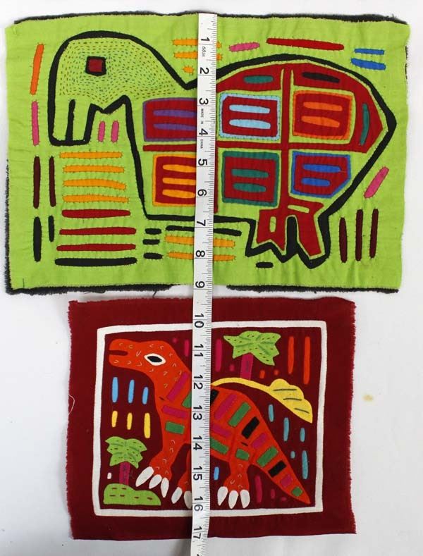 2 San Blas Kuna Indian Molas, largest measures 9" x 13", FYI: "The Kuna (or Guna) Indians are the indigenous people who live on small coral islands in the San Blas Archipelago along the Atlantic coast of Panama and Colombia. Mola, which originally meant bird plumage, is the Kuna Indian word for clothing, specifically blouse, and the word mola has come to mean the elaborate embroidered panels that make up the front and back of a Kuna woman's traditional blouse. Molas are collected as folk art: Kuna women have achieved a worldwide reputation for outstanding artistry."