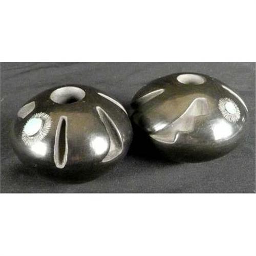 2340 2 Santa Clara Pots with Turquoise Stones Signed Pauline Salazar 1" tall x 2 1/2" dia.