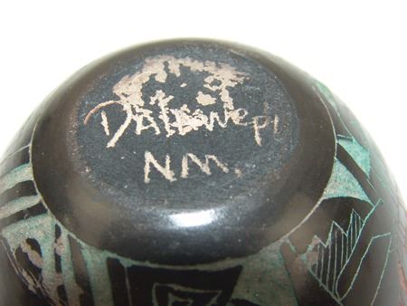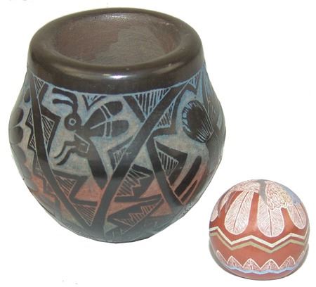 Late 1900s, Pair of very fine miniature blackware polychrome sgraffitto pots, the large olla with kachina heads and ants by Ergo Vallo ("Dalawepi", Hopi), the smaller with blue jay head and feathers by Gregory Lone Wolf. Very good condition. 7/8" x 7/8" & 2" x 2-1/4"