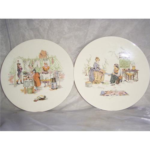 2 Sarrequemines wand plates with a scene of a laundry, where they are ironing and so on, and a scene with a shoe seller with a lady.