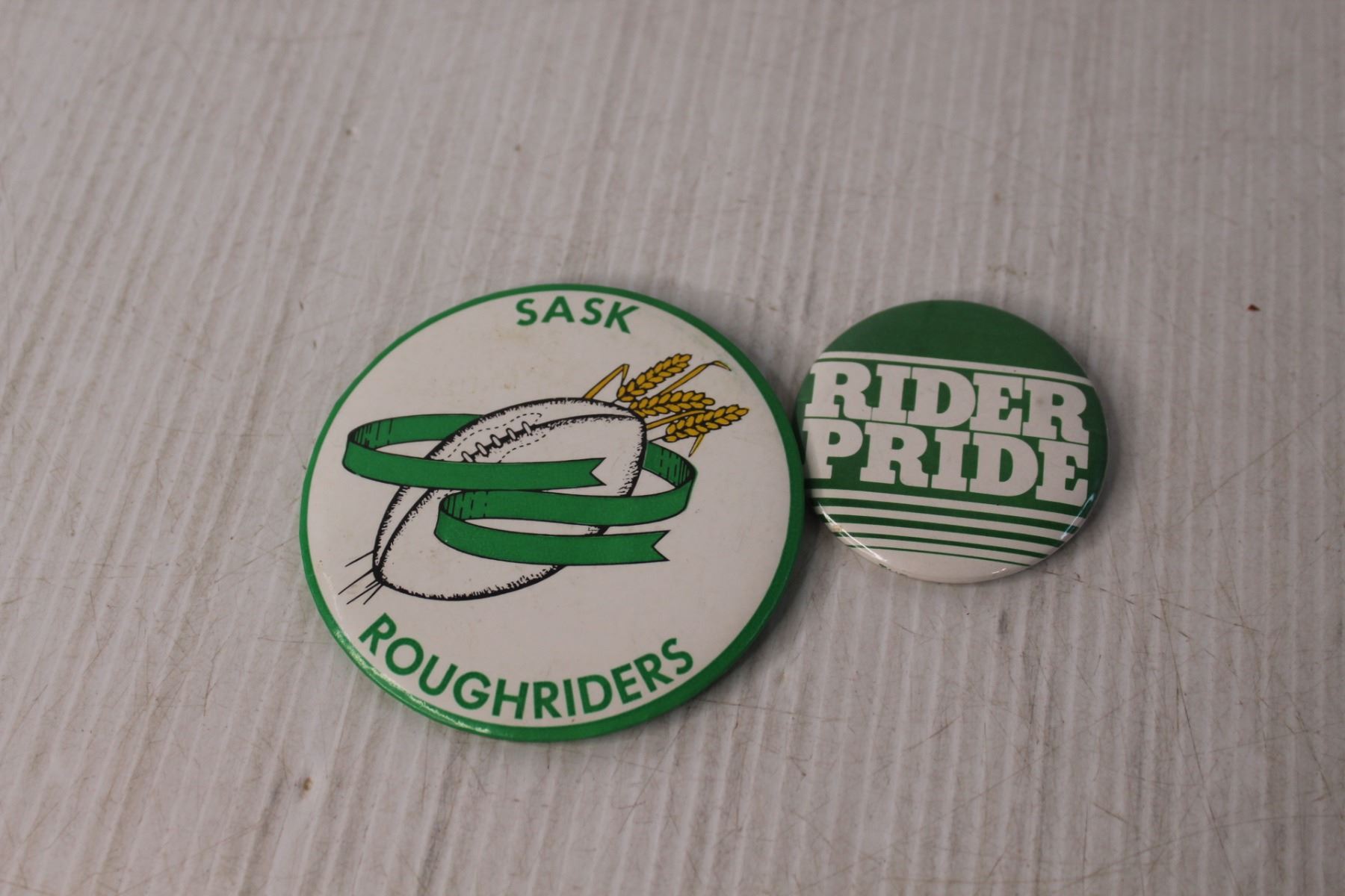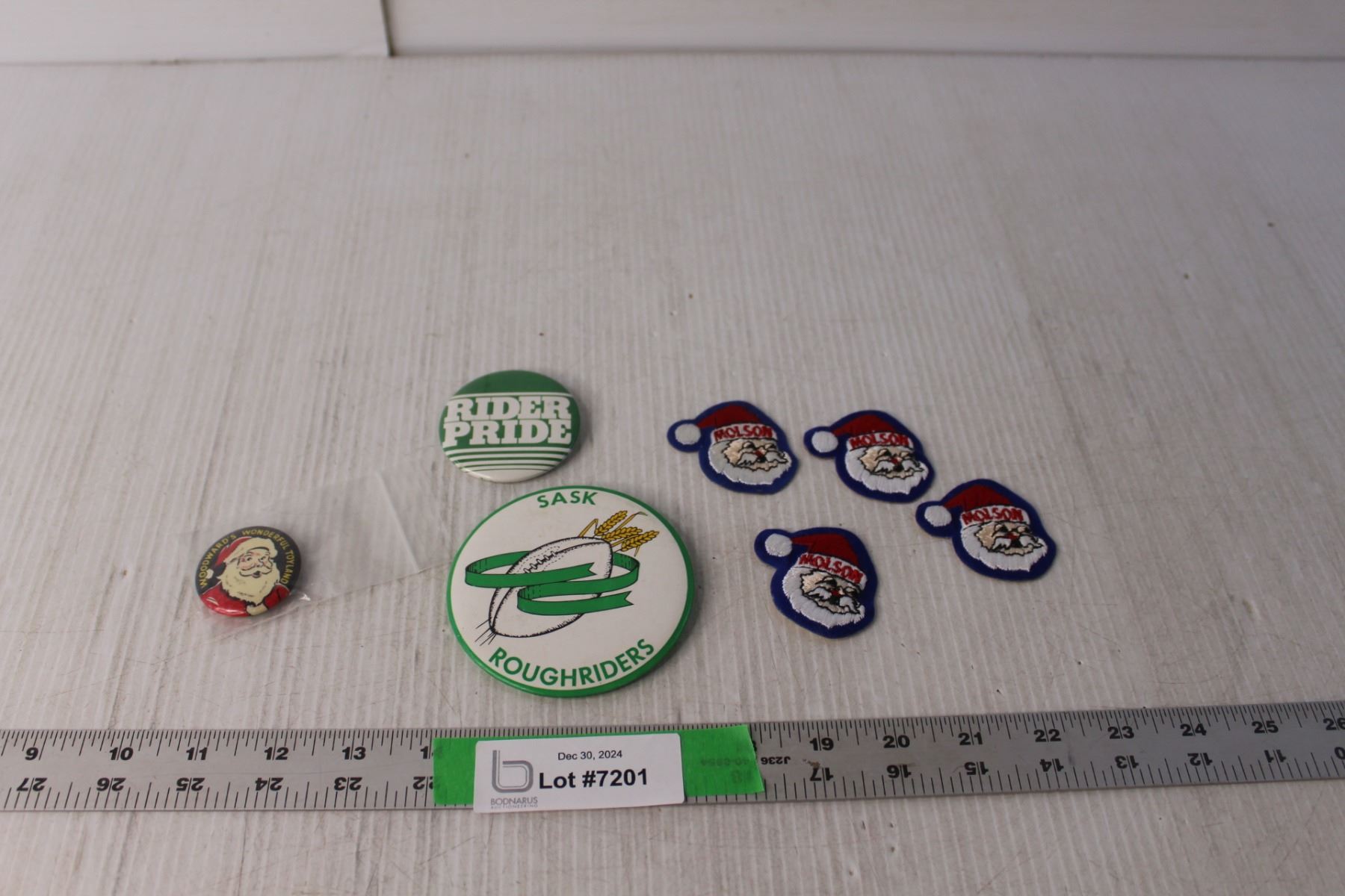 (2) Sask. Roughrider Pins, Santa Pin and Badges