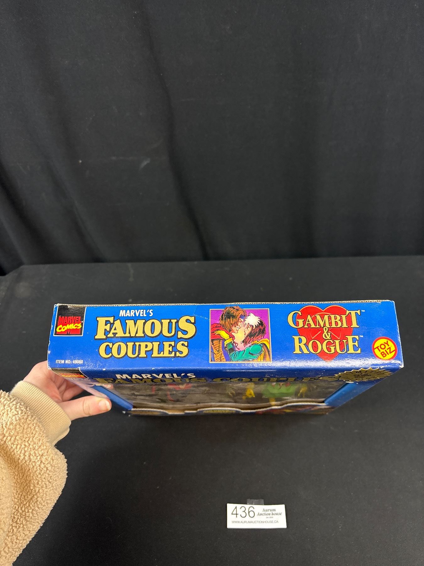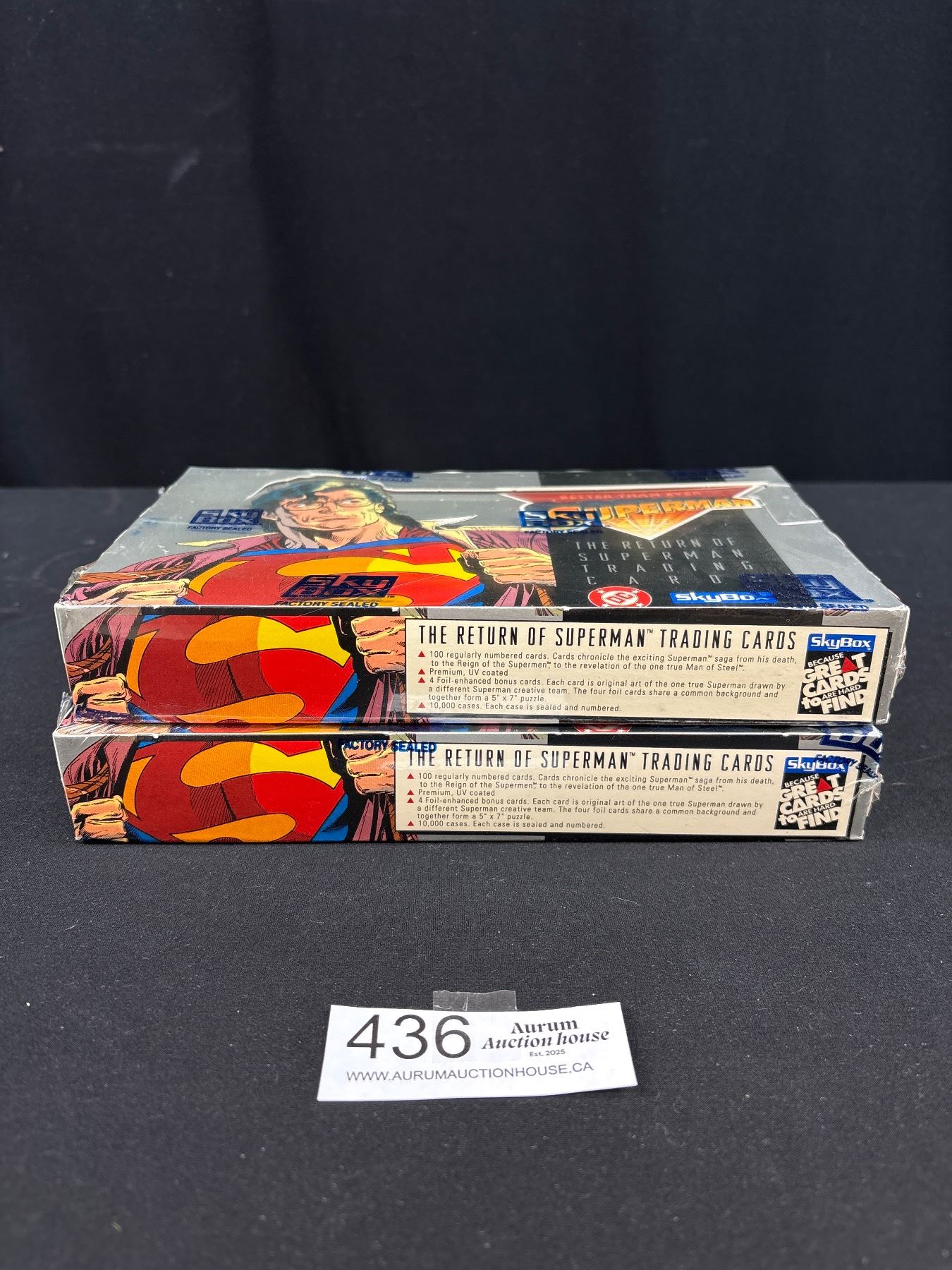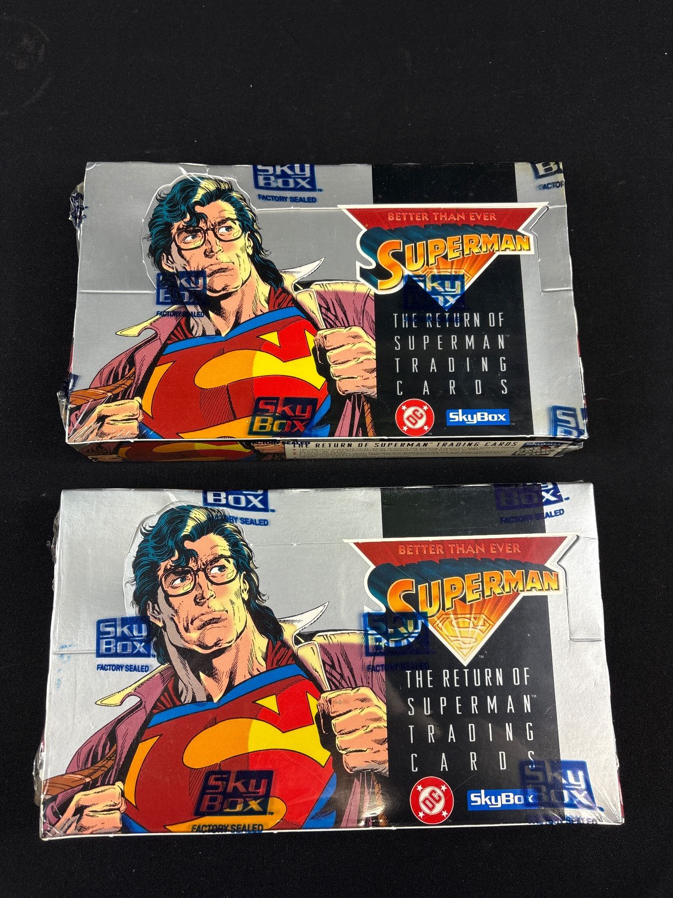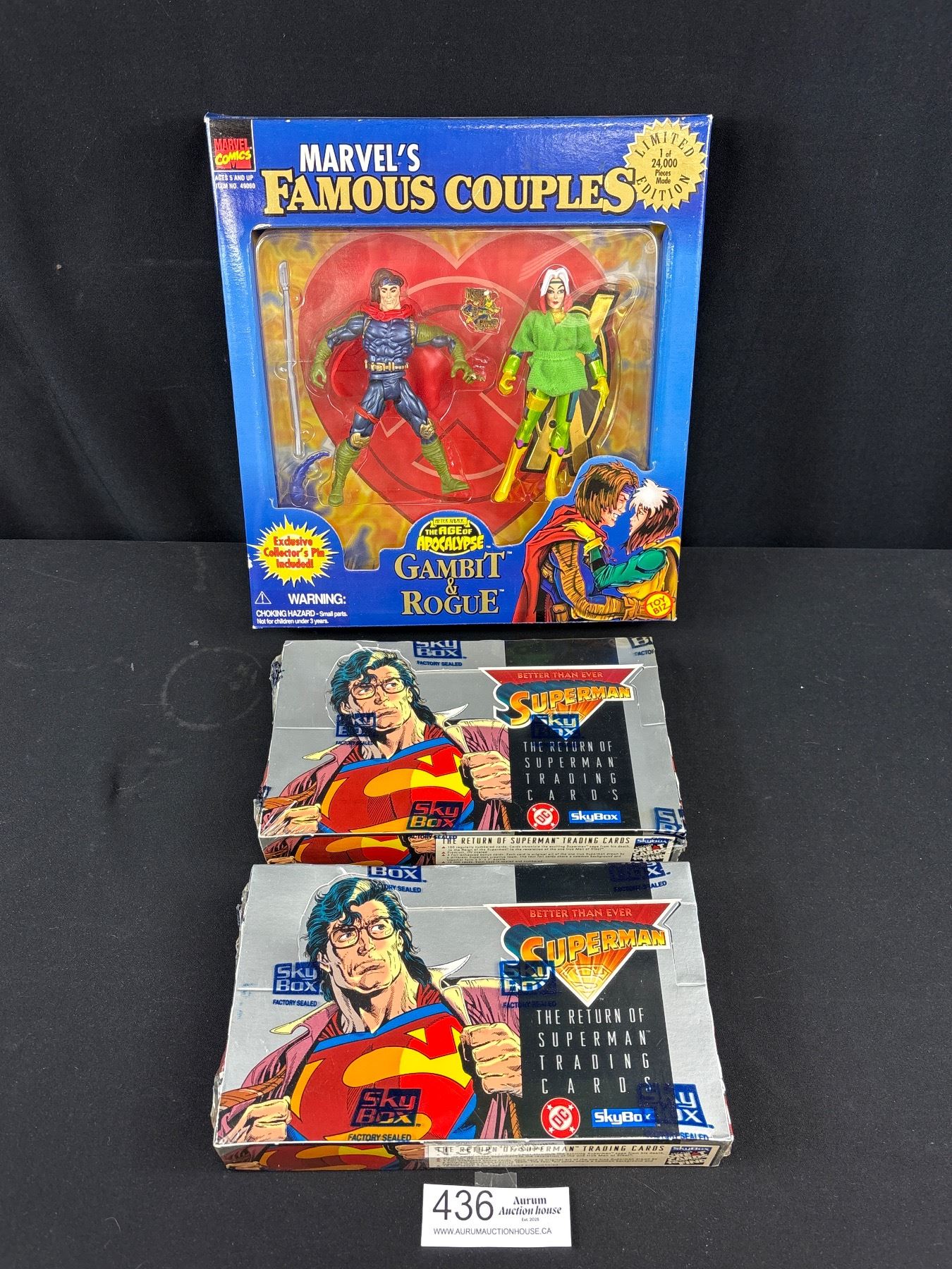 2 Sealed Boxes of Superman Trading Cards + Marvels Famous Couple Figurines In Box