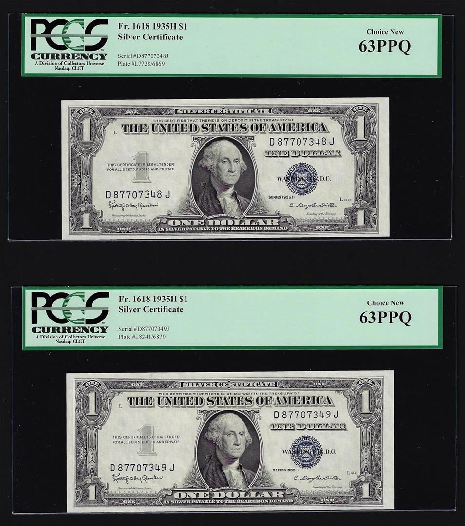 (2) Sequential 1935H $1 Silver Certificate Notes PCGS Choice New 63PPQ