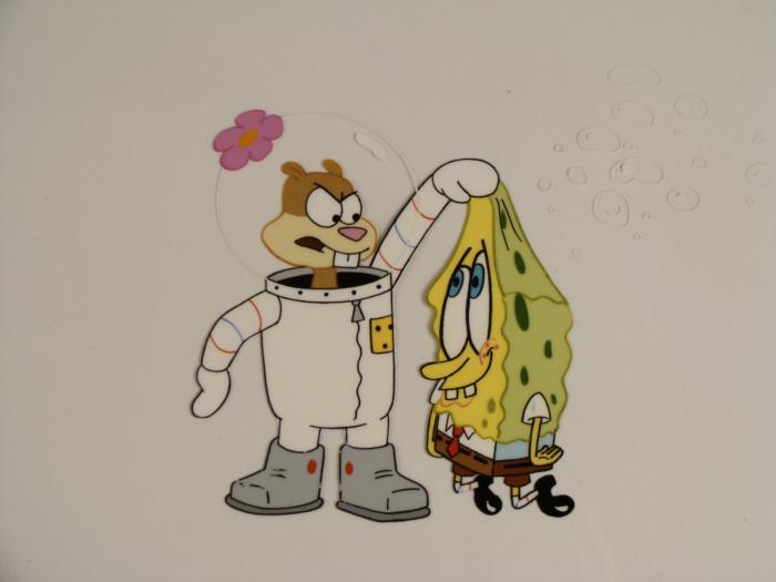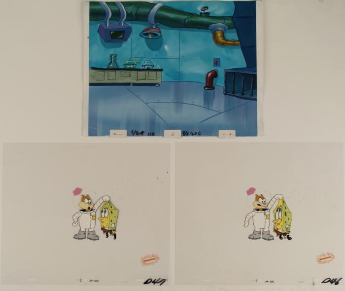 This original hand-painted background and animation cel is from the Nickelodeon TV show SpongeBob Squarepants. The story takes place under the deep blue sea in Bikini Bottom, where SpongeBob resides. SpongeBob, who is a yellow, porous sponge, is your typical happy-go-lucky character, as he is always cheerful and enjoys making people laugh. Patrick Star, SpongeBob's neighbor who is a starfish, is your average children's show idiot, as he boasts knowing nothing and is often getting himself into ridiculous situations. Between the homes of these two lies the home of the miserable Squidward, a squid, who is known for being grouchy and playing tricks on SpongeBob and Patrick. Both SpongeBob and Squidward work at the Krusty Krab, a fast food business run by the greedy money-loving Mr. Krabs, a crab, the arch rival of the evil, possibly misunderstood, Plankton. Another neighbor, Sandy Cheeks, an athletic squirrel who normally wears an astronaut's space suit, was introduced in "Tea at the Treedome." She spends most of her time inventing and experimenting. The new version of Stretch Armstrong; stretch Spongebob, stretch!Original Production Background and Animated Cel Overall Size of Background: 10 1/2" x 13 1/4" Overall Size of the Cel: 10 1/2" x 12 1/2" Very good condition; it has been stored This is an original hand-painted cel set-up used in the production of an episode of "SpongeBob SquarePants." Each one-of-a-kind set-up represents a slight change in position of the characters. When individually photographed and projected in rapid succession, the images appear to move.
