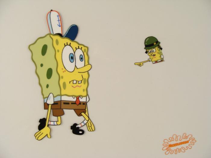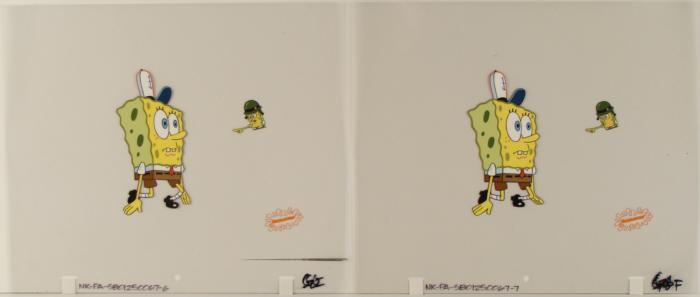 This original animation cel is from the Nickelodeon TV show SpongeBob Squarepants. The story takes place under the deep blue sea in Bikini Bottom, where SpongeBob resides. SpongeBob, who is a yellow, porous sponge, is your typical happy-go-lucky character, as he is always cheerful and enjoys making people laugh. Patrick Star, SpongeBob's neighbor who is a starfish, is your average children's show idiot, as he boasts knowing nothing and is often getting himself into ridiculous situations. Between the homes of these two lies the home of the miserable Squidward, a squid, who is known for being grouchy and playing tricks on SpongeBob and Patrick. Both SpongeBob and Squidward work at the Krusty Krab, a fast food business run by the greedy money-loving Mr. Krabs, a crab, the arch rival of the evil, possibly misunderstood, Plankton. Another neighbor, Sandy Cheeks, an athletic squirrel who normally wears an astronaut's space suit, was introduced in "Tea at the Treedome." She spends most of her time inventing and experimenting. These are two sequential cels of SpongeBob going through what seems to be boot camp. Or is it just a dream?Original Production Animated Cel Overall Size of the Cels: 10 1/2" x 12 1/2" Excellent ConditionThis is an original hand-painted cel set-up used in the production of an episode of "SpongeBob SquarePants." Each one-of-a-kind set-up represents a slight change in position of the characters. When individually photographed and projected in rapid succession, the images appear to move.