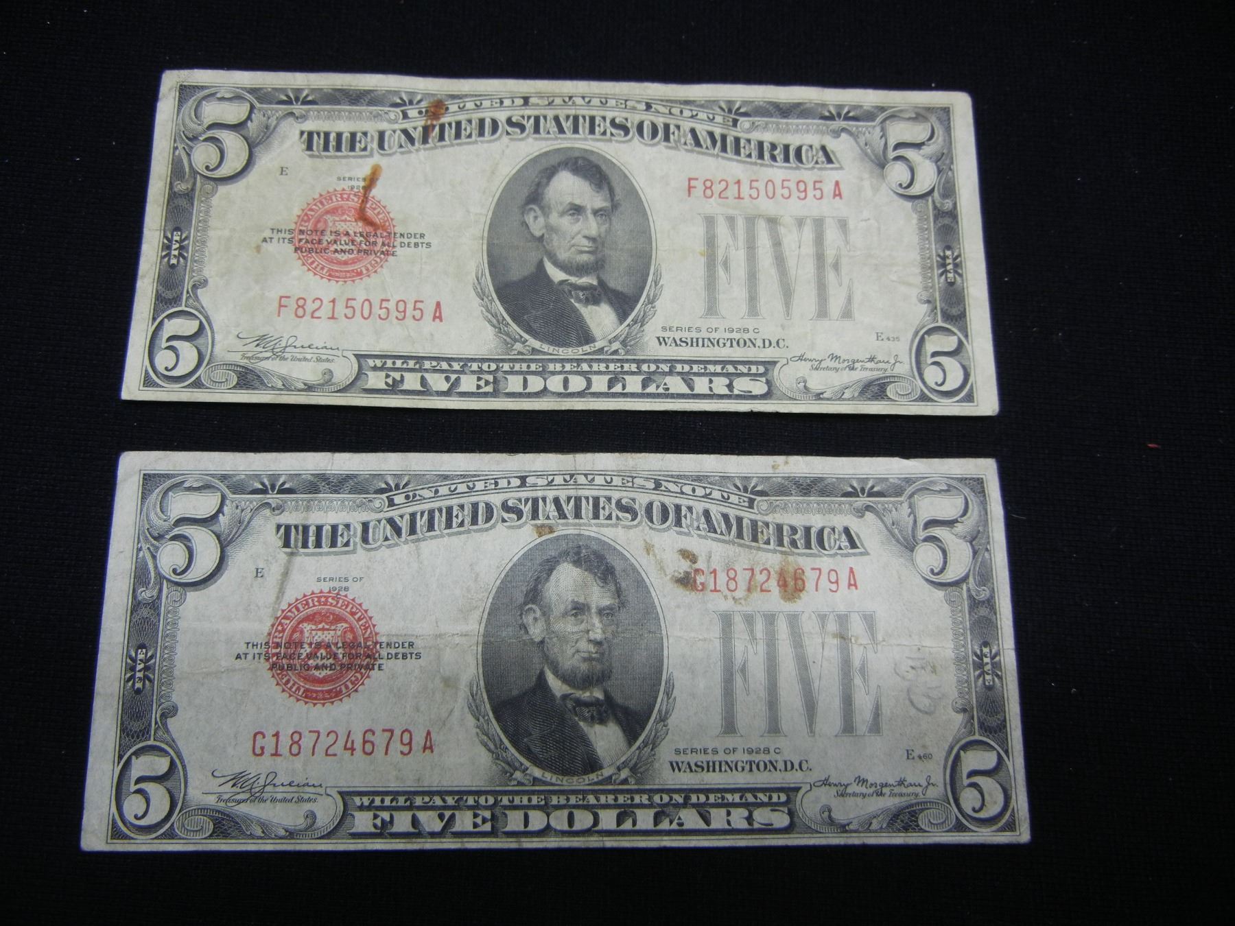 2 - Series 1928 C United States $5.00 Red Seal Notes
