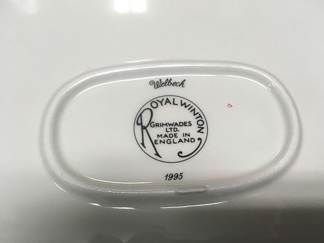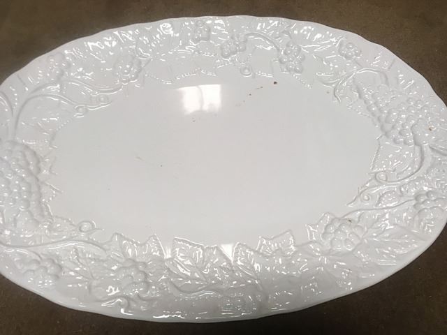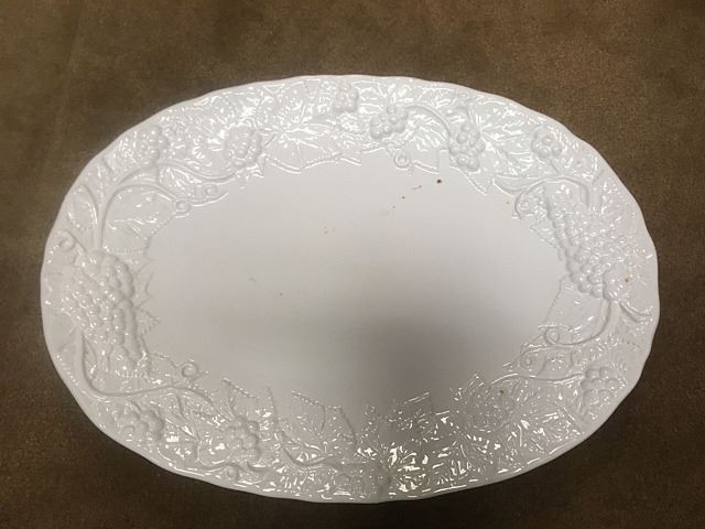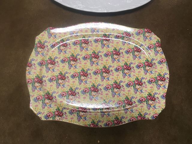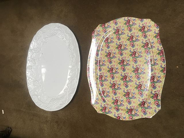 2 serving trays, one white with grapevines Eurosecla, Portugal, and the other is flower pattern, Royal Winton, England.
