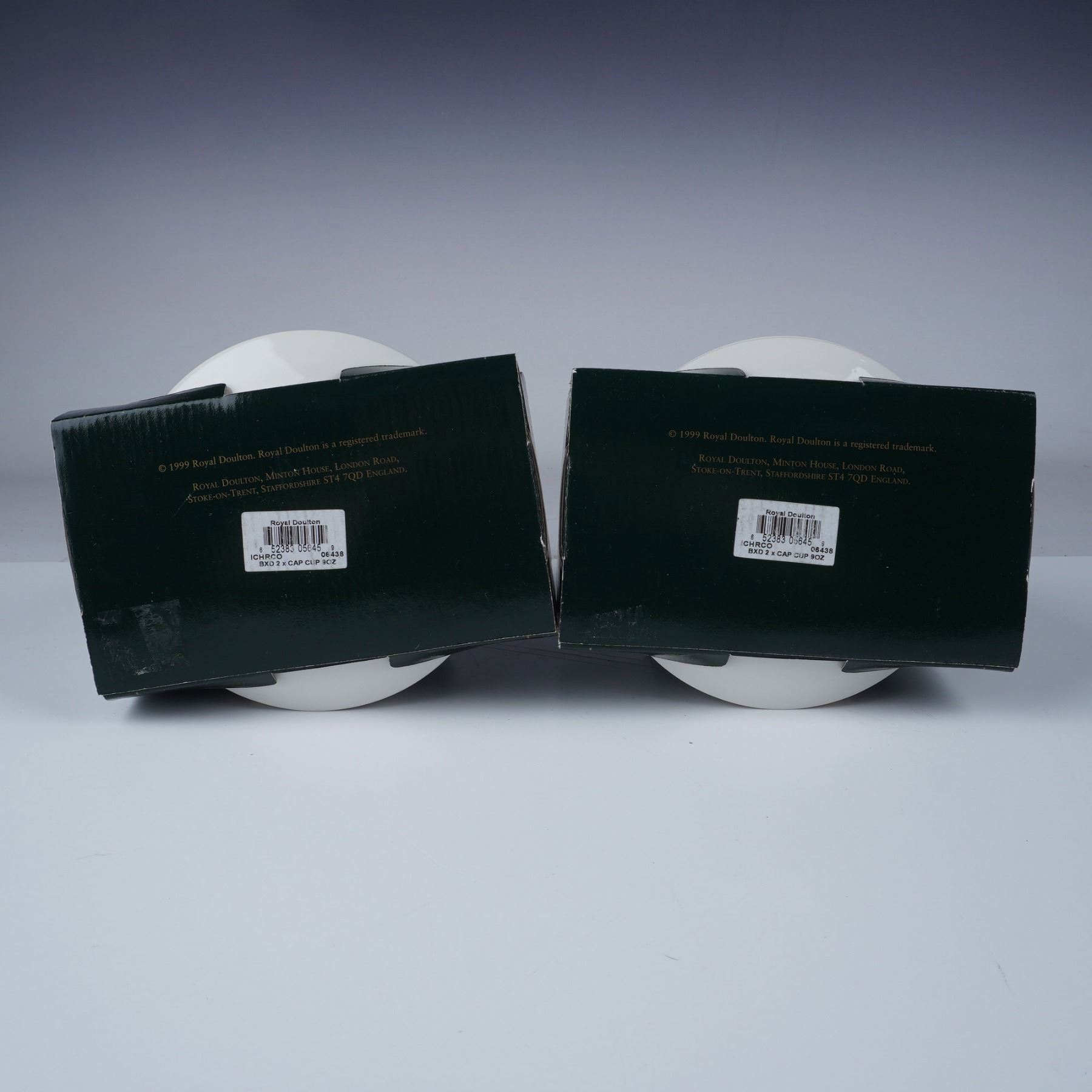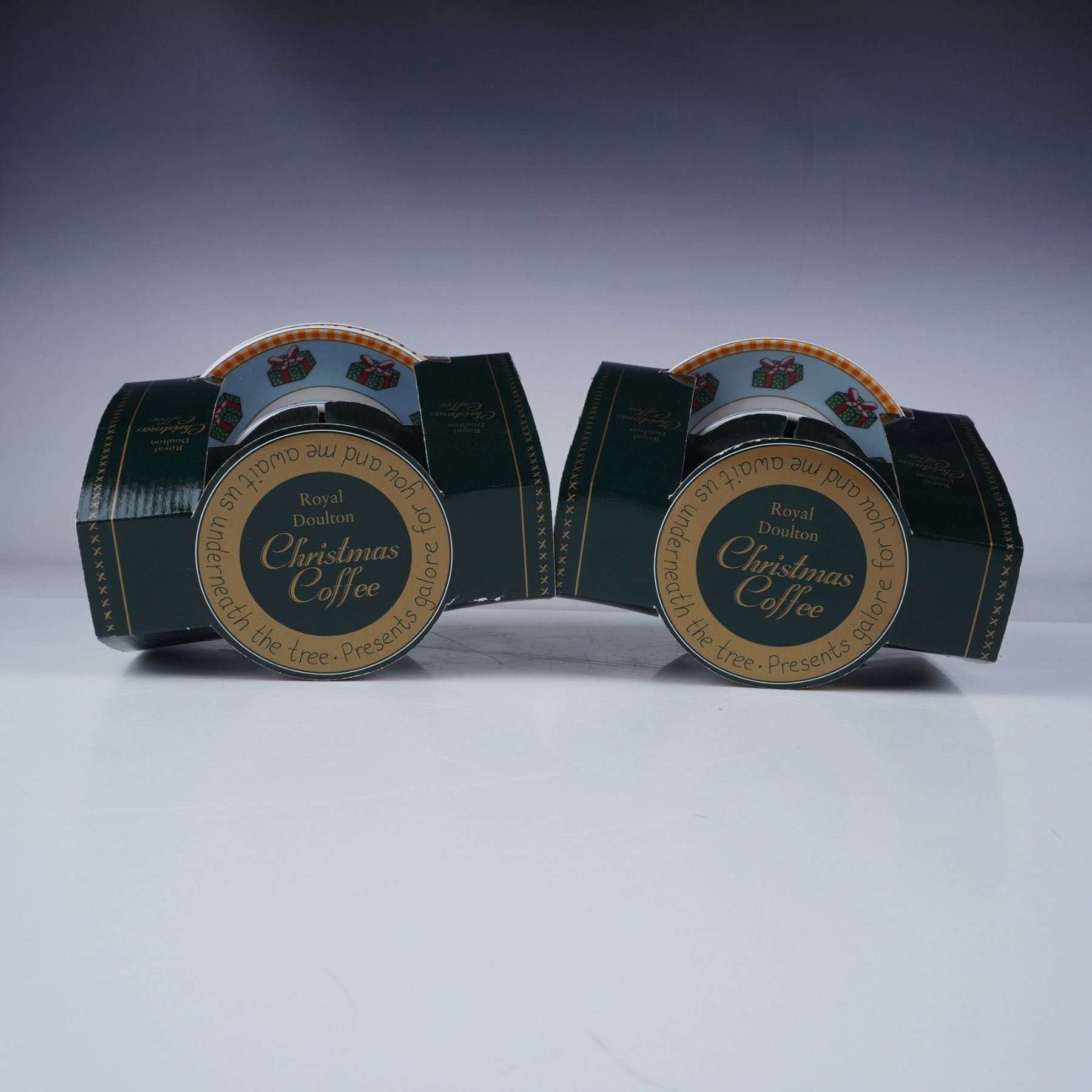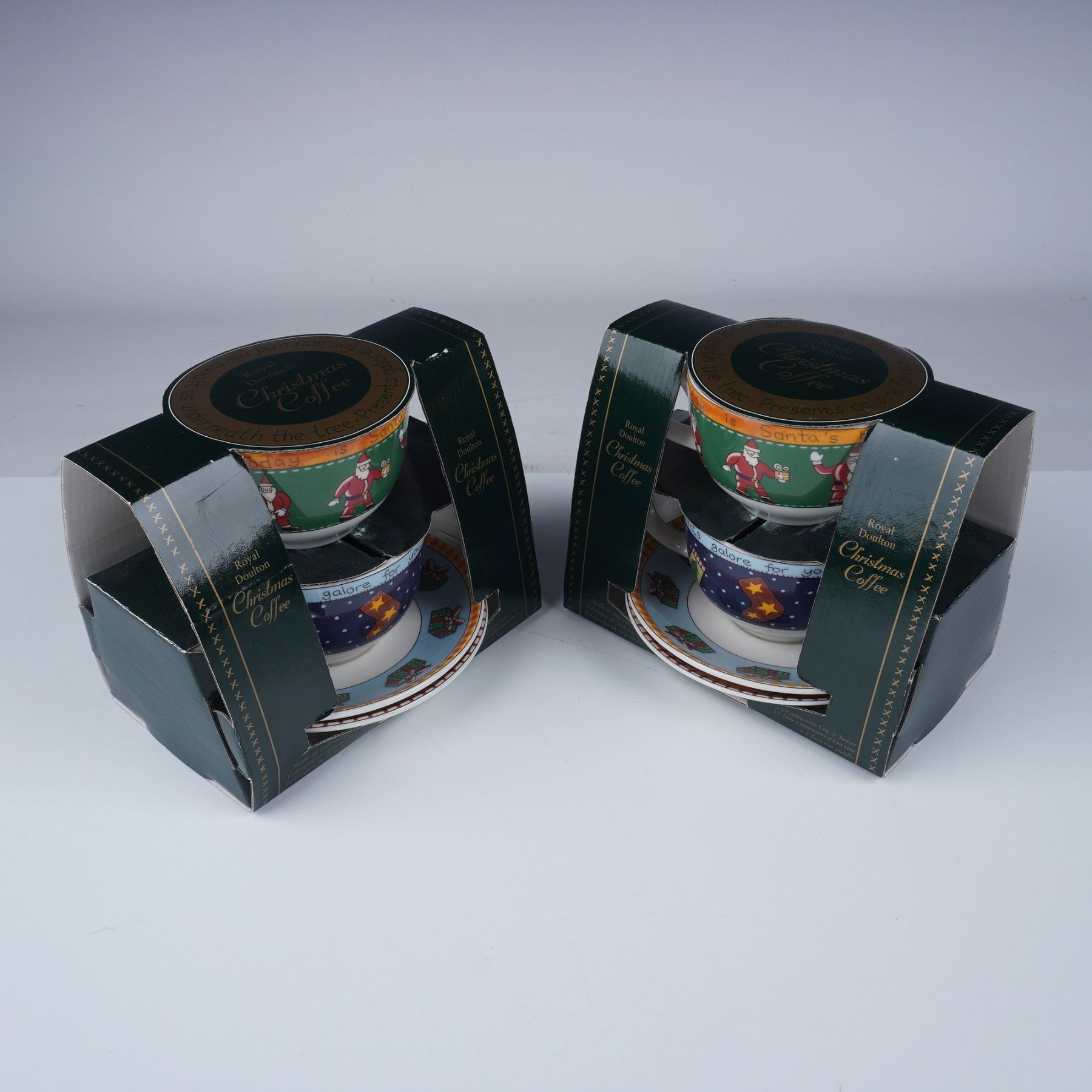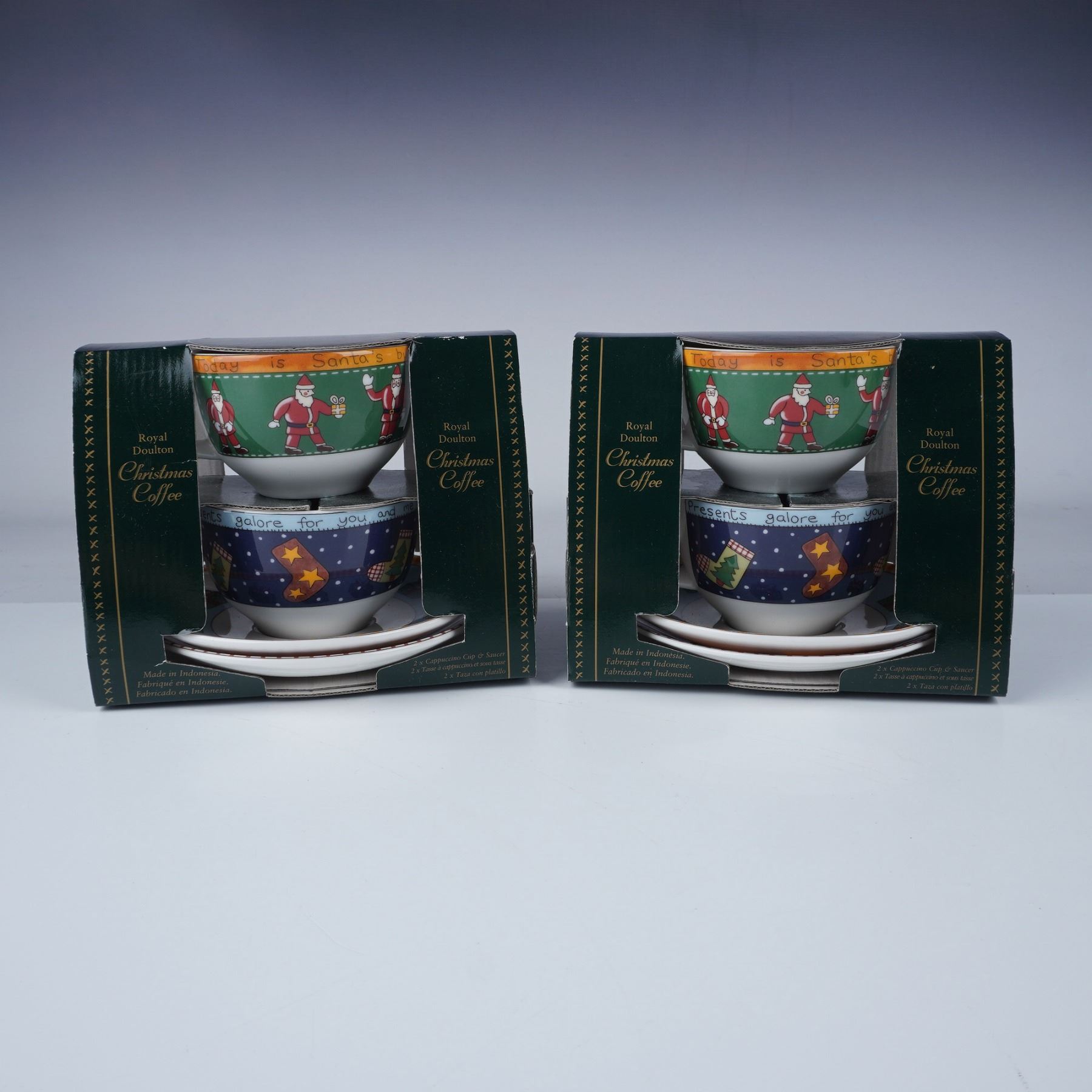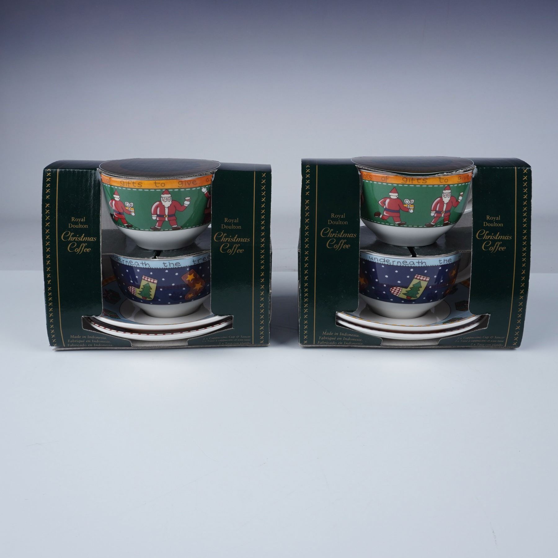 This lot includes two boxed sets of Royal Doulton Christmas Coffee cups and saucers. Each set contains two cups and two matching saucers, for a total of four cups and four saucers across both sets. Featuring festive holiday designs with Santa and Christmas motifs, these sets were produced in 1999, marked Royal Doulton, and made in Indonesia. Each cup holds 9 oz. Box dimensions are approximately 7"L x 5.75"H. Both sets are in their original packaging.