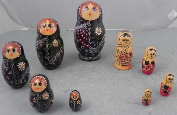 Here are two sets of Russian nesting dolls, and they include one with 5 dolls, and one with 4 dolls. All are hand painted. The large one is black with beautiful floral designs, and the other is natural yellow tone in a more traditional, provincial style. The sizes of the larger set of dolls measure from 6 inches tall down to 1 1/2 inches. The smaller set is 3 1/2 to 1 1/4 inches, and it is marked Made in USSR. * These sets show two different styles of the beloved nesting dolls.