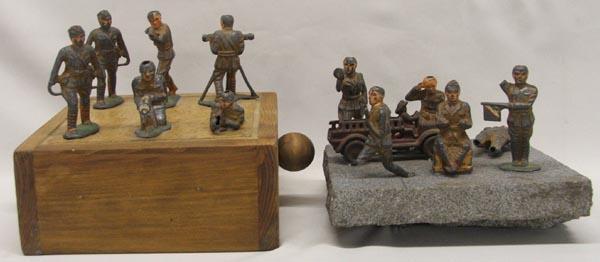 2 Sets Vintage Lead Soldiers. First Set has 6 soldiers and a fire truck on rock. Second set has 6 soldiers. Tallest soldier measures approx. 3''. SHI $25.