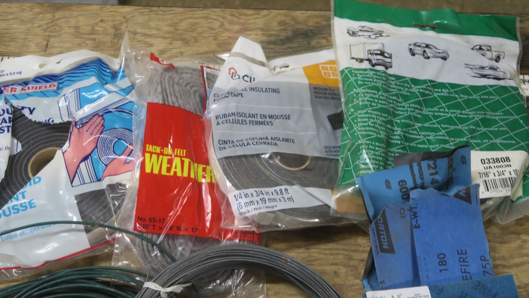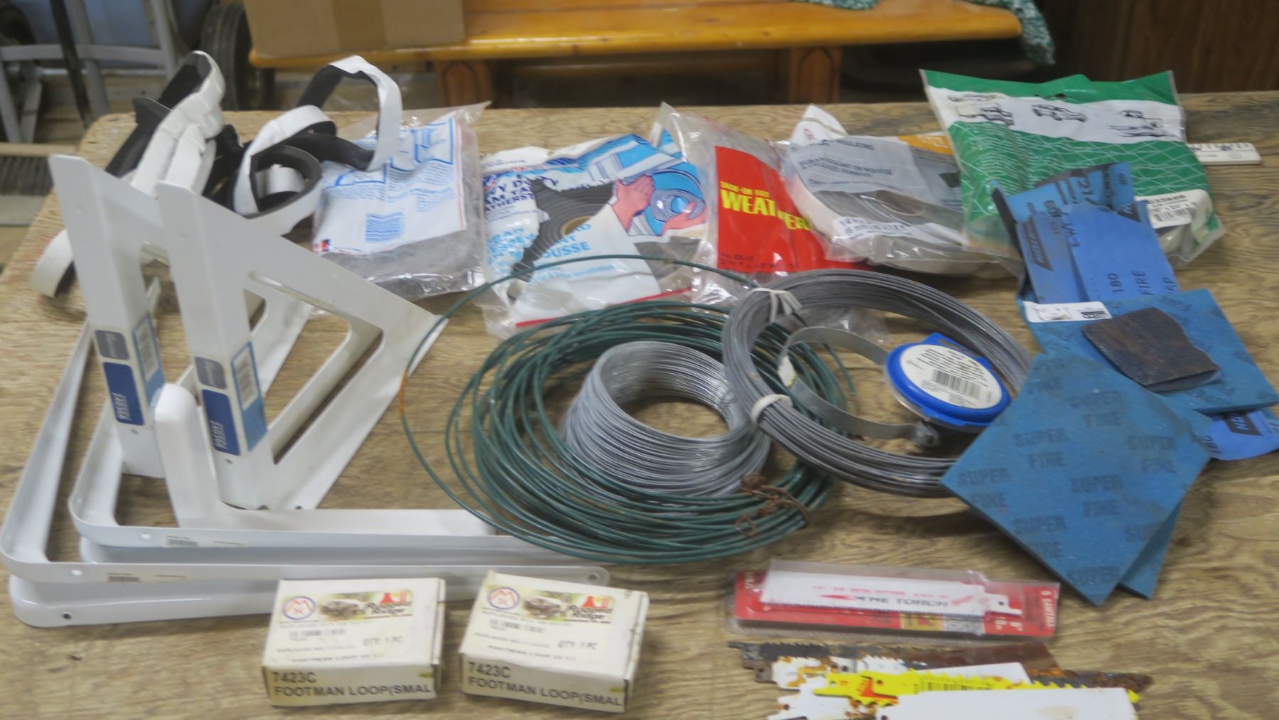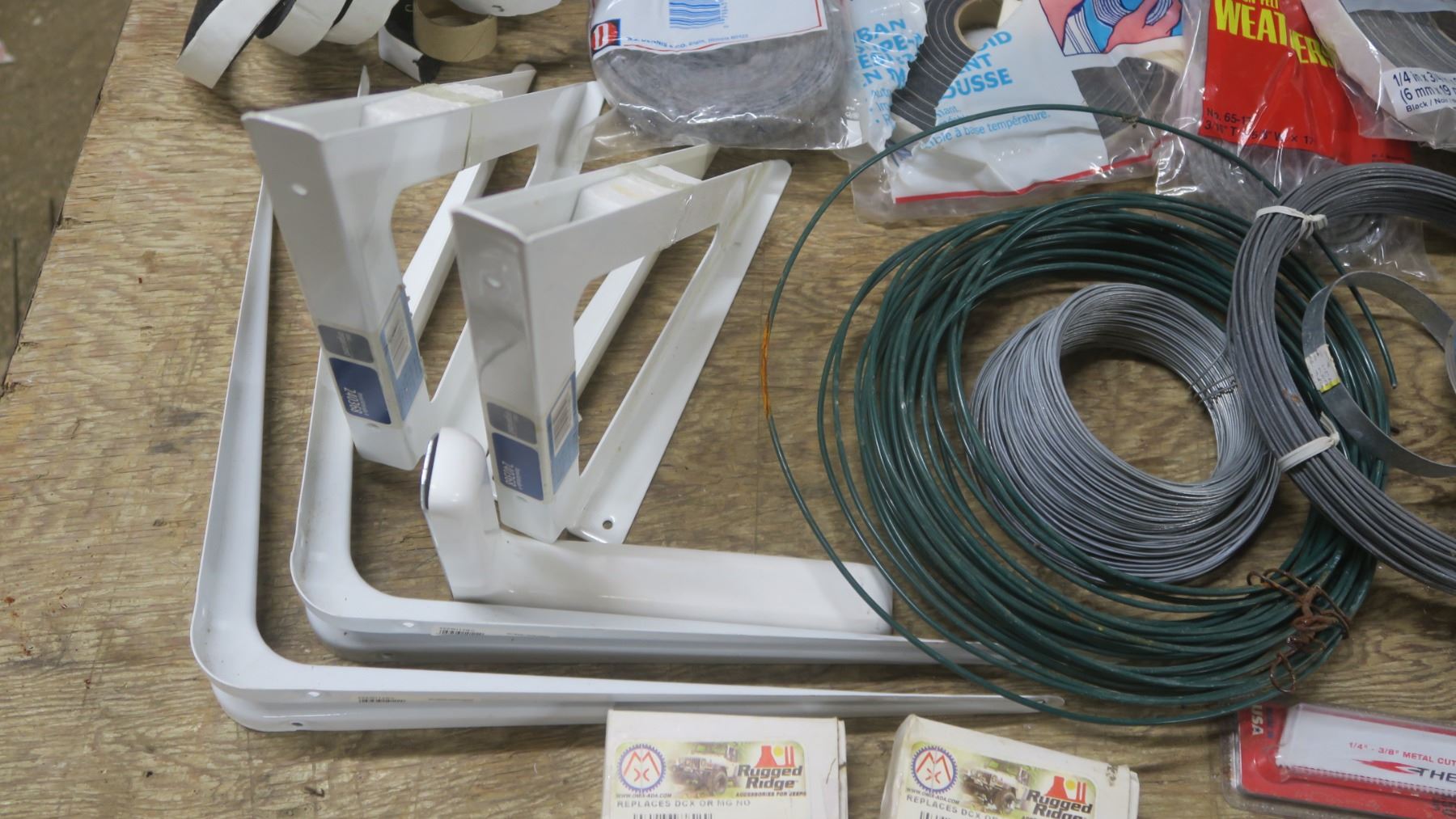 2 Sets of Brackets / Various Weather Strip - New in Package / Various Rolls of Steel Line / Sawzall Blades / 2 x Footman Loop / Various Wire