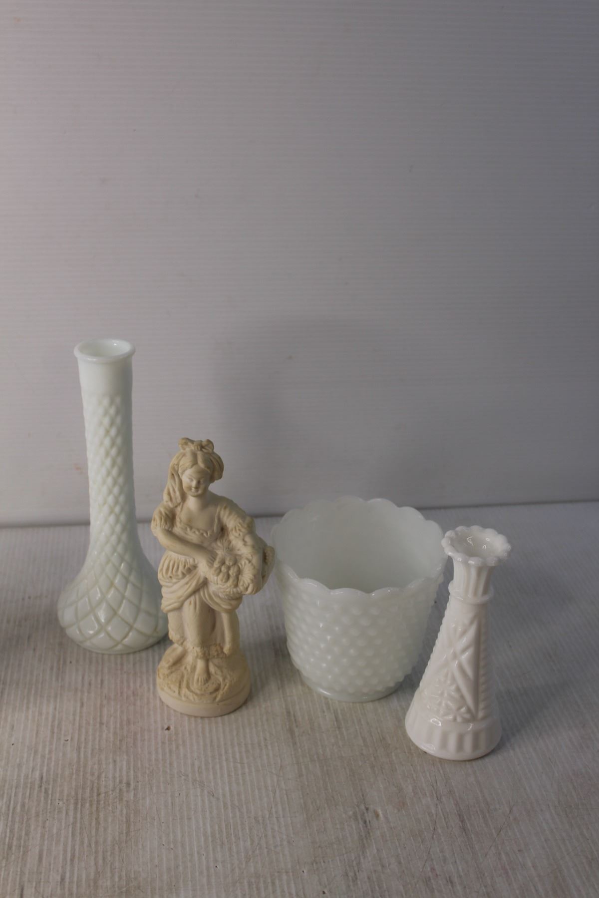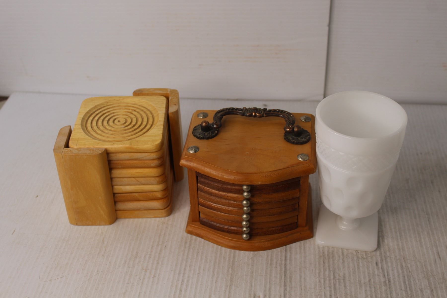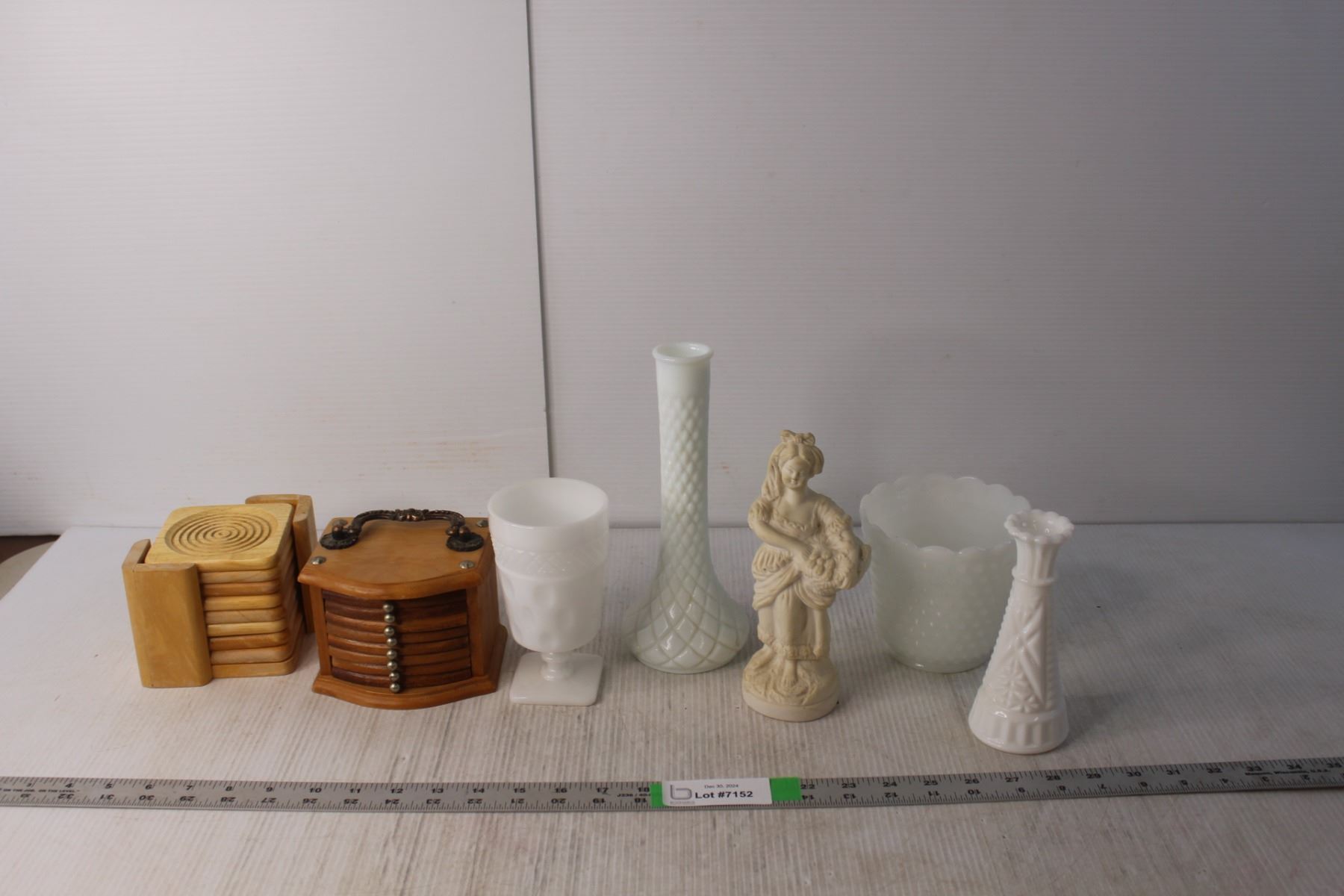 (2) Sets of Coasters in Holders, (3) Milk Glass Vases, Milk Glass Cup, and Misc.