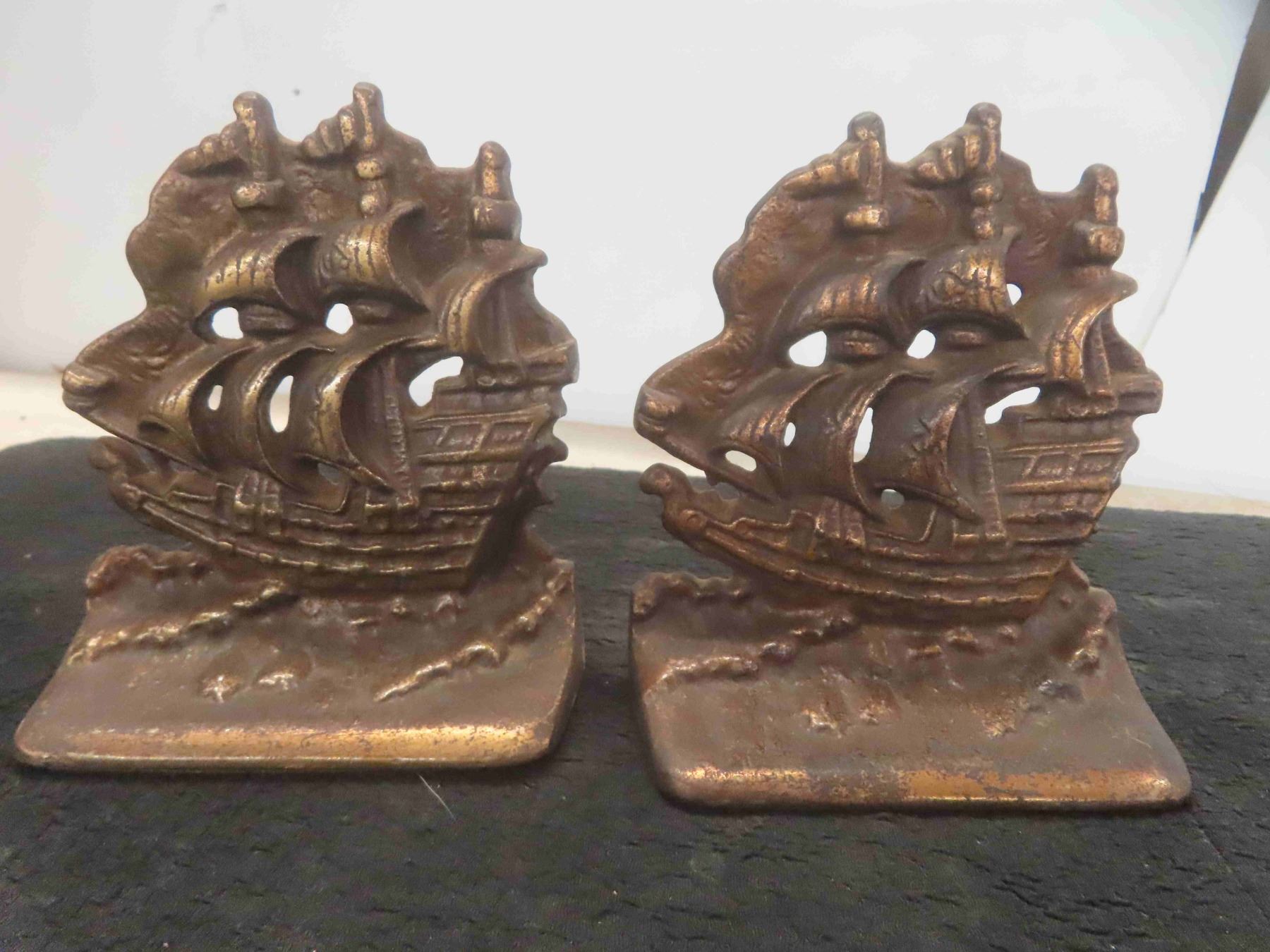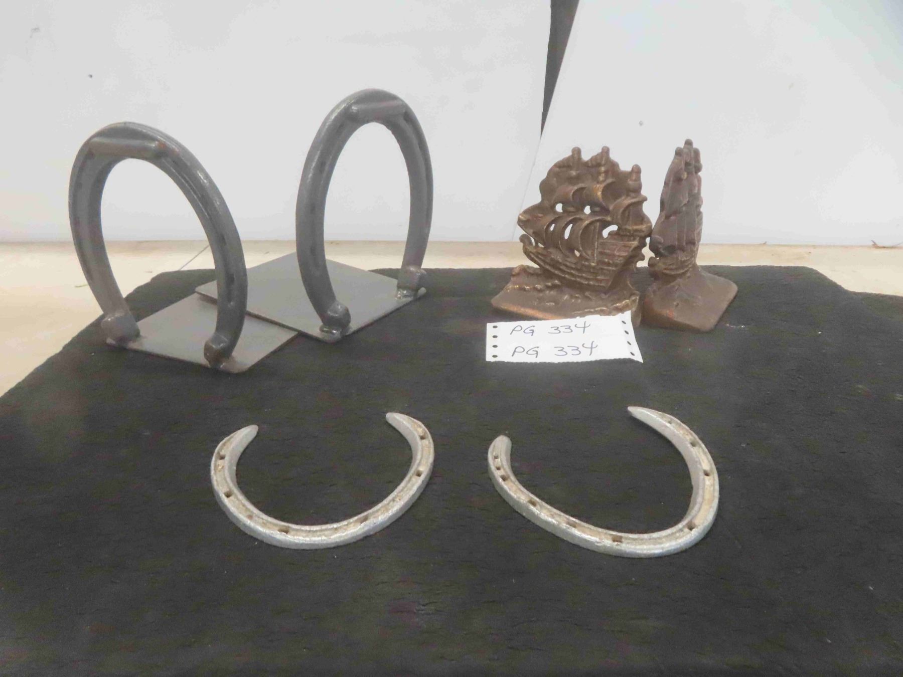 2 Sets of Heavy Matching Book Ends : Real Horse Shoe Book Ends 7 1/2'' x 6'' , Brass Ship Book Ends 5 1/2'' Tall , & a Pair of 2H Bolton England Aluminum Horse Shoes 4 1/2'' x 4 1/2''