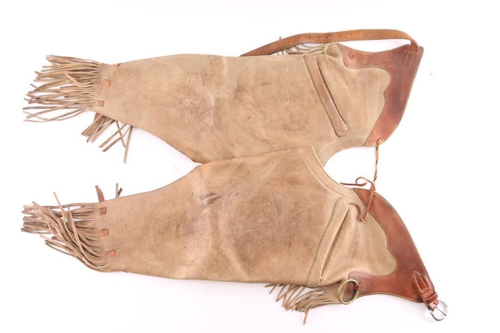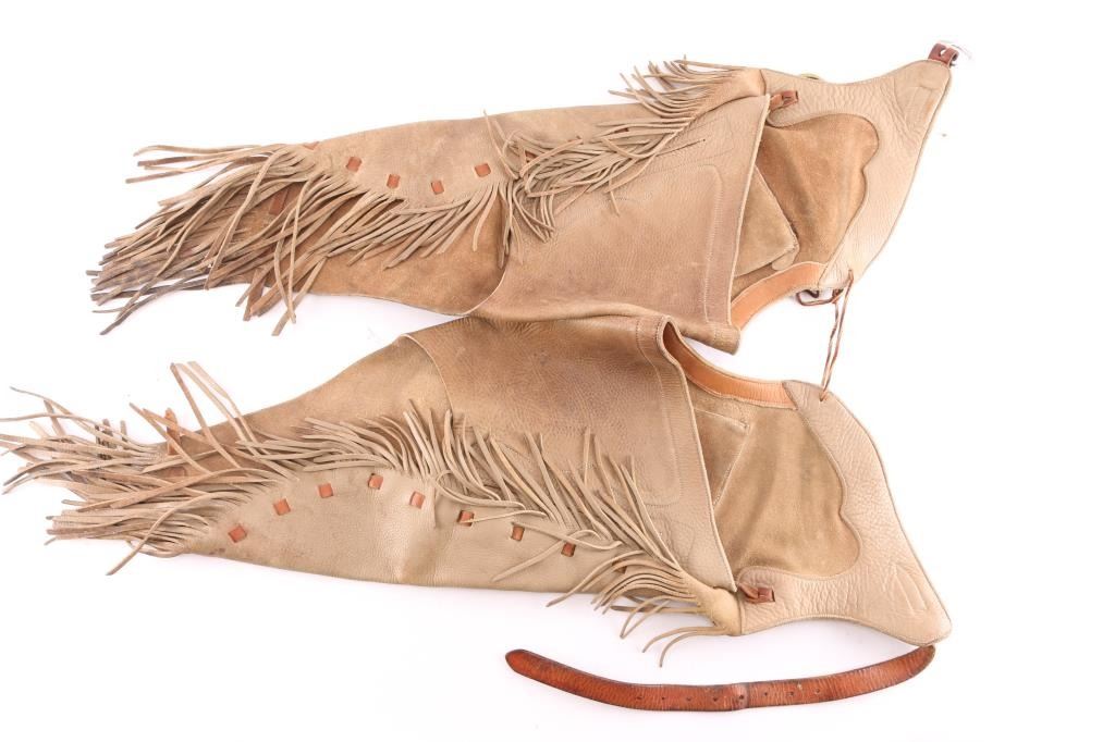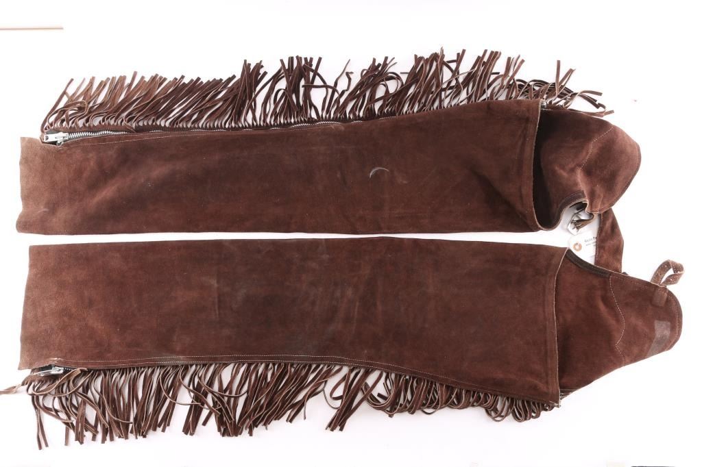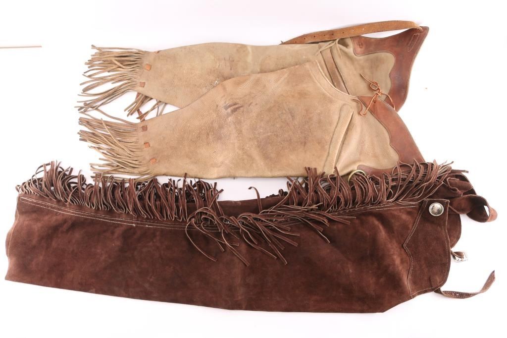 (1) Chocolate Brown color chaps. 38" waist, 41" length with fringe and zippers on side. (1) 37" waist, 26" length tan chaps with fringe.