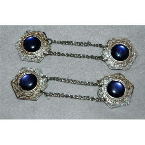 2 pairs of cape closure button sets. The metal frame encases a blue thermo-set plastic buttons that has the shank. In each pair the buttons are connected by a chain. <p> Each metal button ensemble is 1 7/16 across from flat side to flat side. The Measurement of the whole entire pair from the pointed edges across to the other button is 4 3/4". I think for sewing purposes the chain should be draped in the middle to give it the correct effect. So that is something to keep in mind before cutting the button holes. <P>