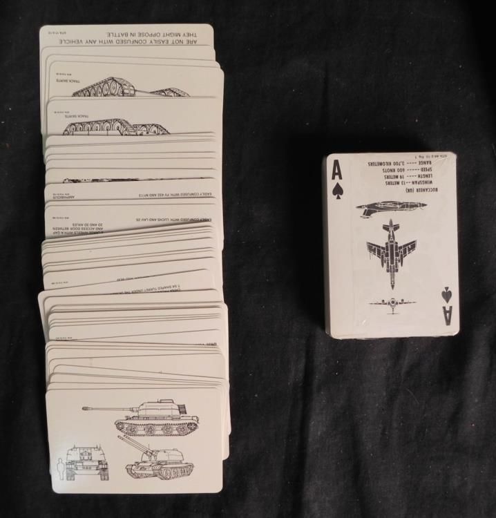 Available here are 2 sets of Vehicle Recognition Study Cards, distributed by the army. One is an Armored Vehicle set and the other is aircraft. The aircraft cards are actually also playing cards, and are unopened.